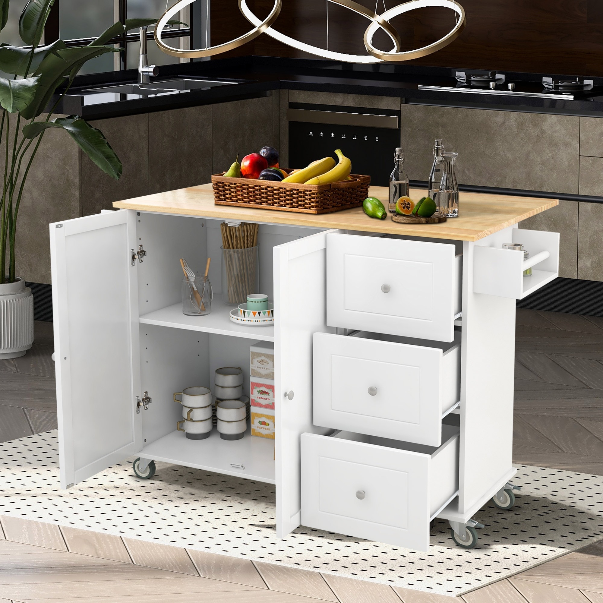 52.2'' Kitchen Cart on Wheels with Rubber Wood Countertop, Sliding Door, Storage Cabinet and 2 Drawers - 52.2''×20.5''×36.6''