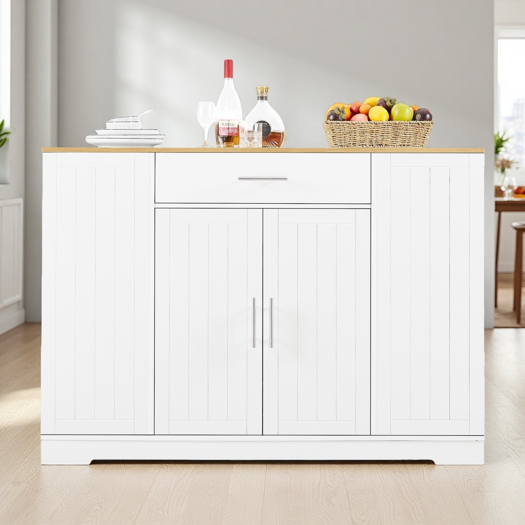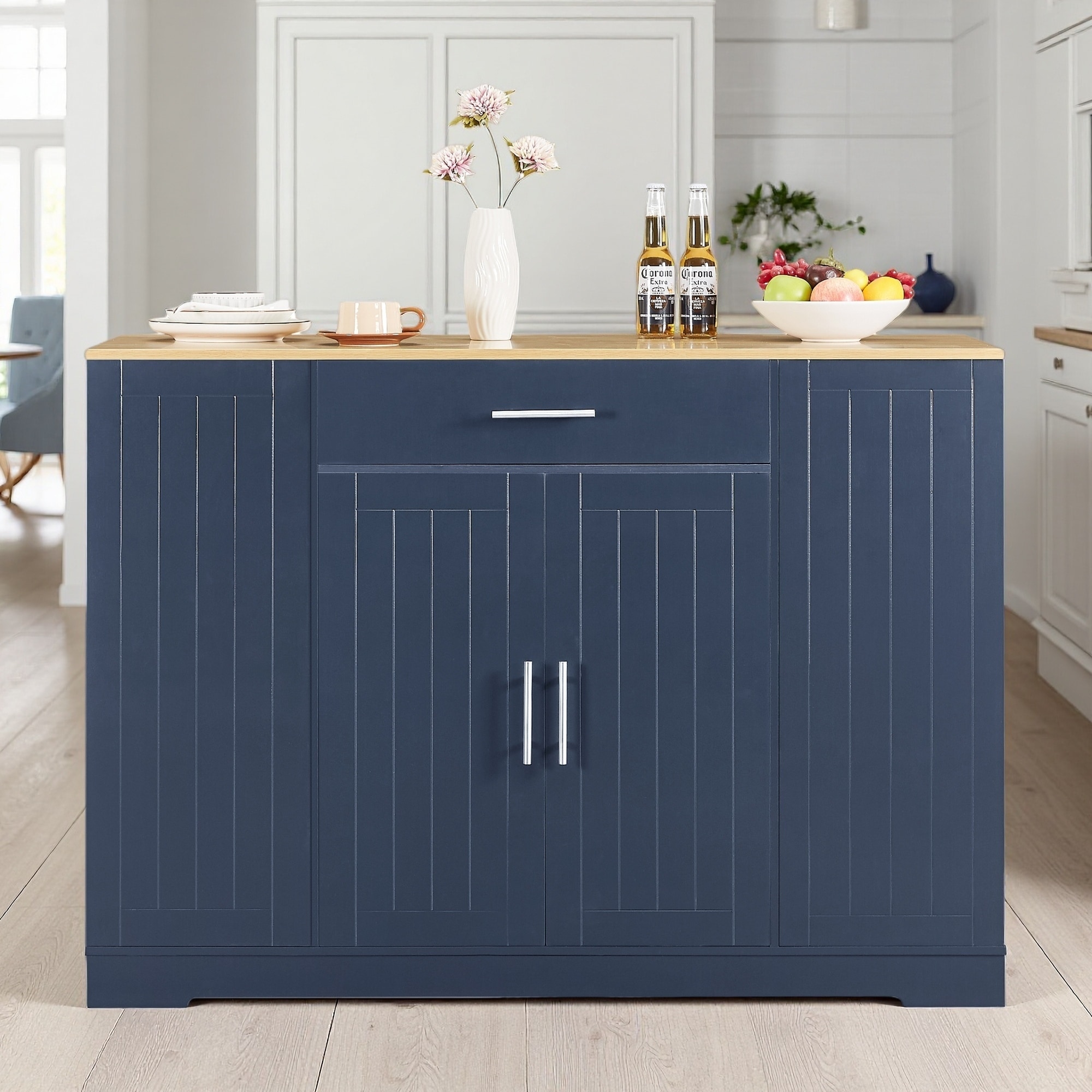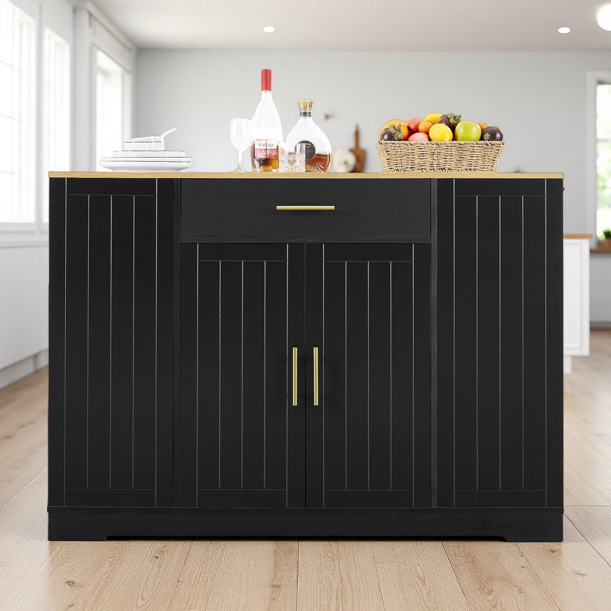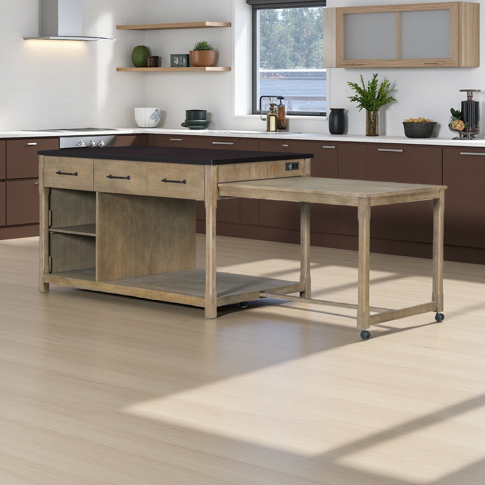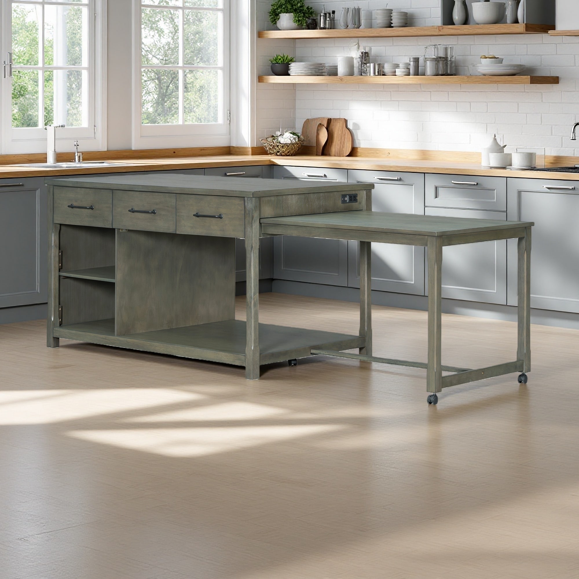 Kitchen Island with Built-In Power Outlets, Drawers and Open Shelves
