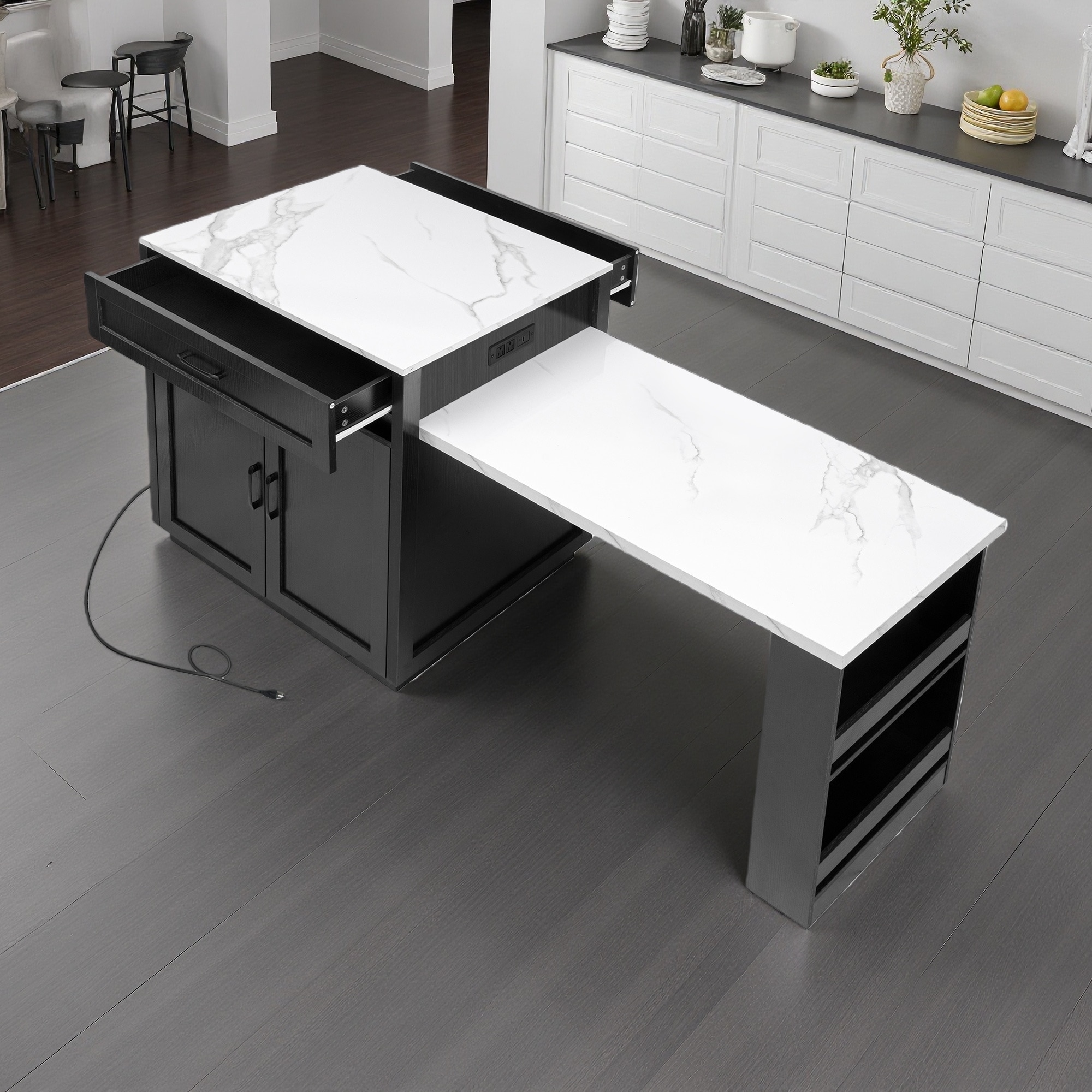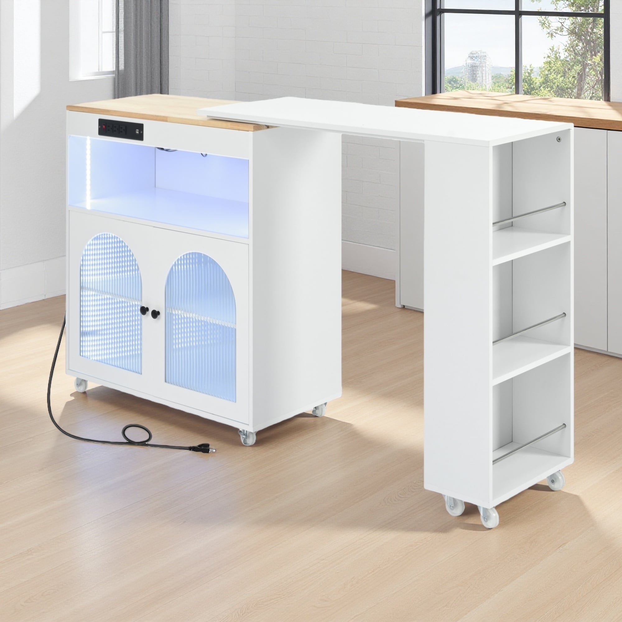Storage Kitchen Island with Extendable Dining Table on Wheels and 3 Removable Middle Leaves, Power Outlet, Arch Cabinet, Light