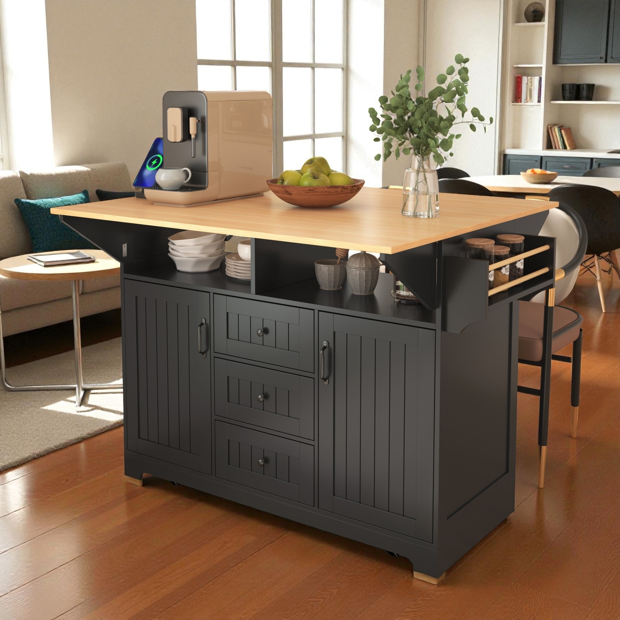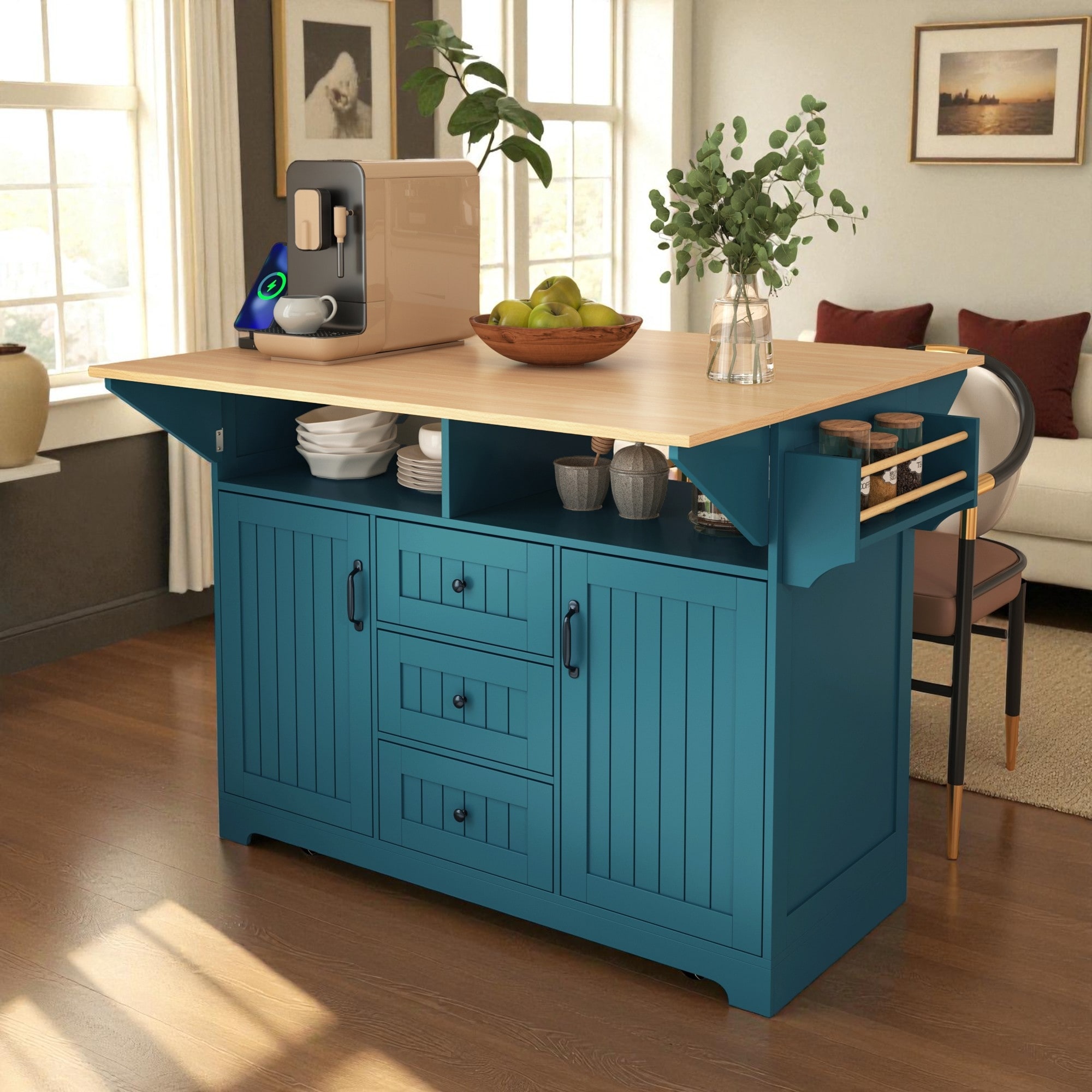 55.7" Large Kitchen Island with Dual Drop Leaf, Power Outlet, Rolling Kitchen Cart with Drawers & Storage Cabinet