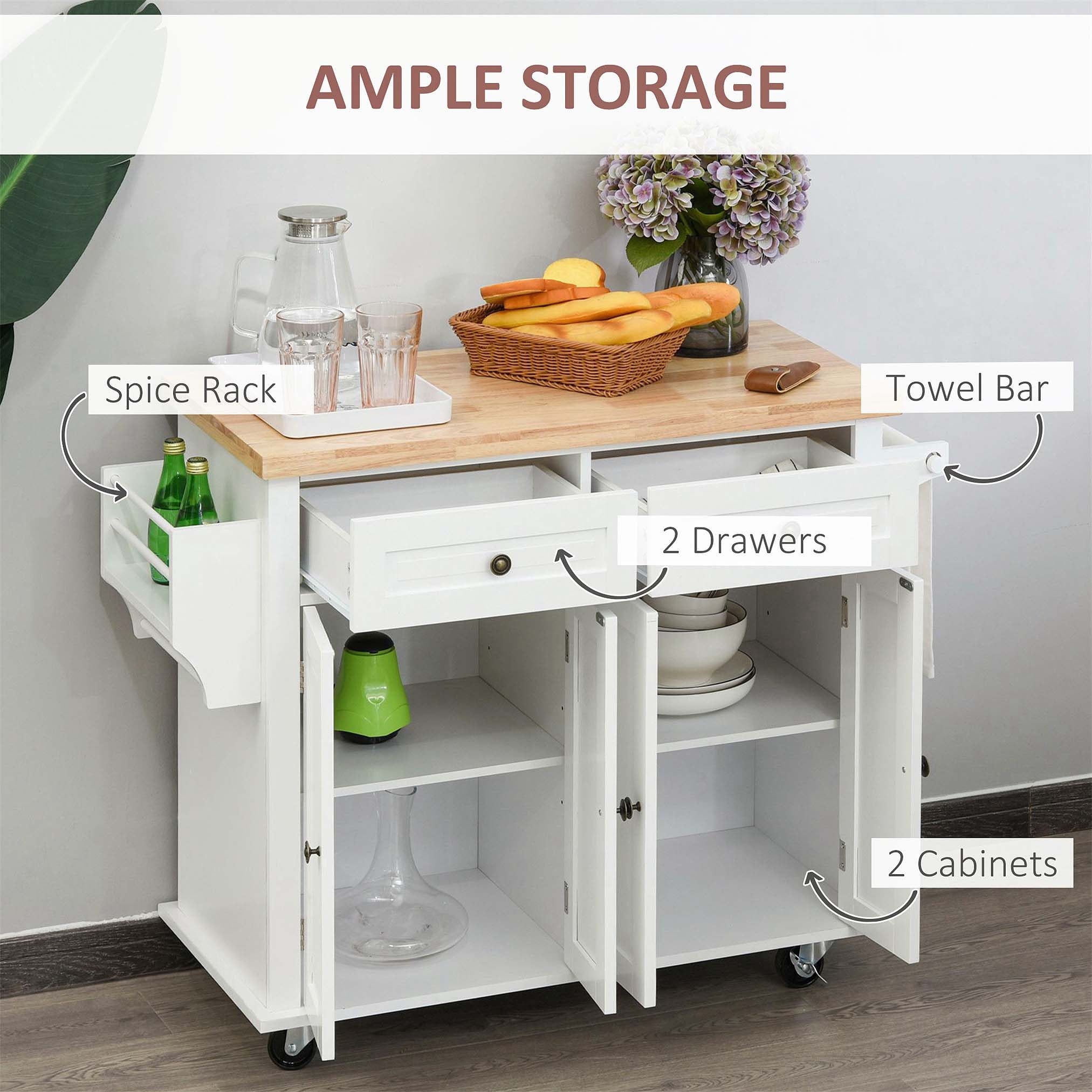 White Kitchen Island Cart on Wheels with Solid Rubber Wood Top, Storage Drawer & Adjustable Shelving