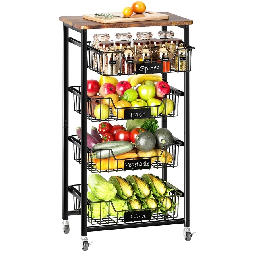 5-Tier Vegetable Fruit Basket Kitchen Storage Rolling Cart on Wheels with Pull-Out Baskets and Wood Top