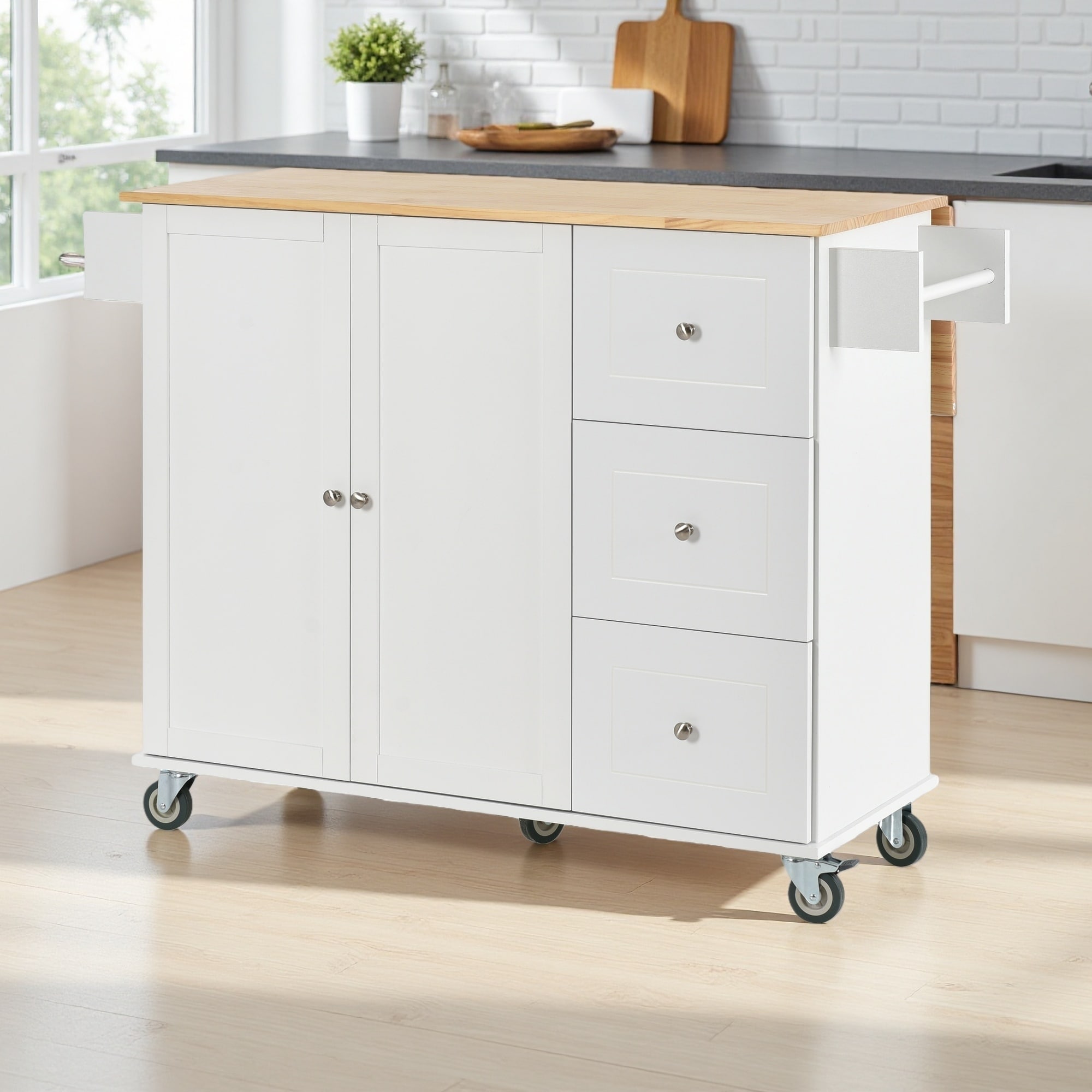 50 in. W Kitchen Island Rubberwood Top on 5 Wheels with 3 Drawers and 2 Slide-Out Shelf