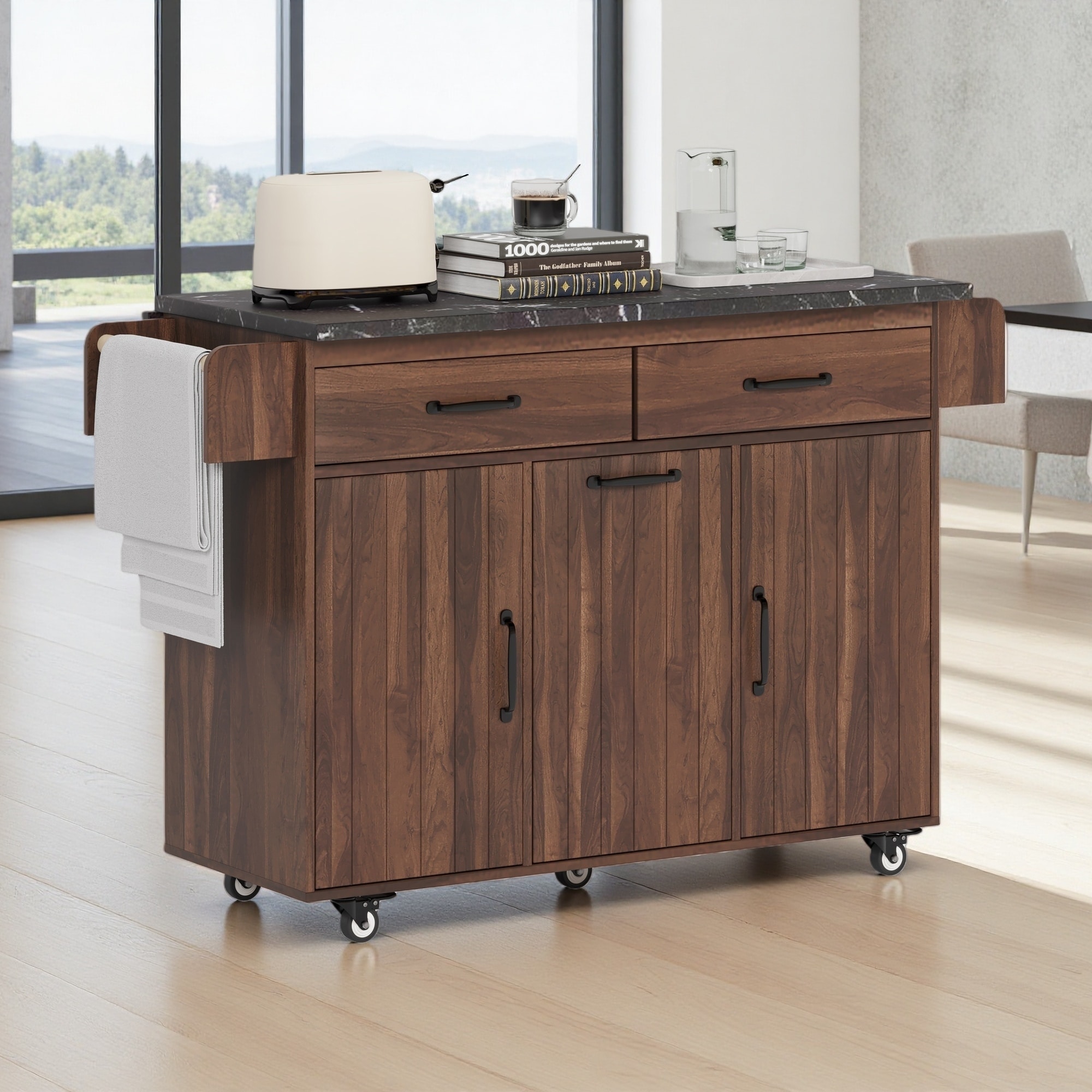 Kitchen Island with Trash Can, Towel Rack and Drawer