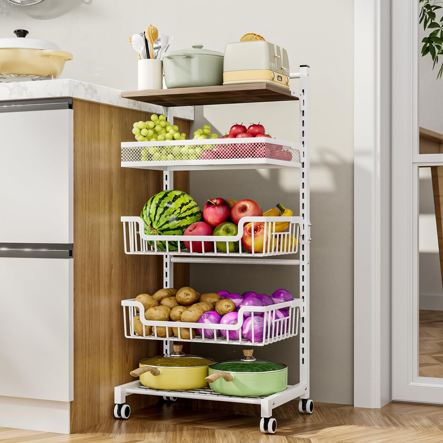 Fruit Basket Vegetable Basket 5 Tier Adjustable Kitchen Storage Cart,Wooden Top Table Fruit & Vegetable Car Snack Cart