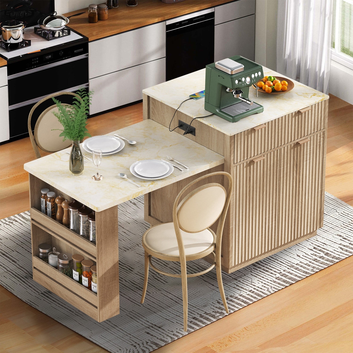 Fluted Kitchen Island with Pull-out Dining Table, Island Table with Power Outlet, 2 Drawers and Credenza, 2-in-1 Kitchen Carts