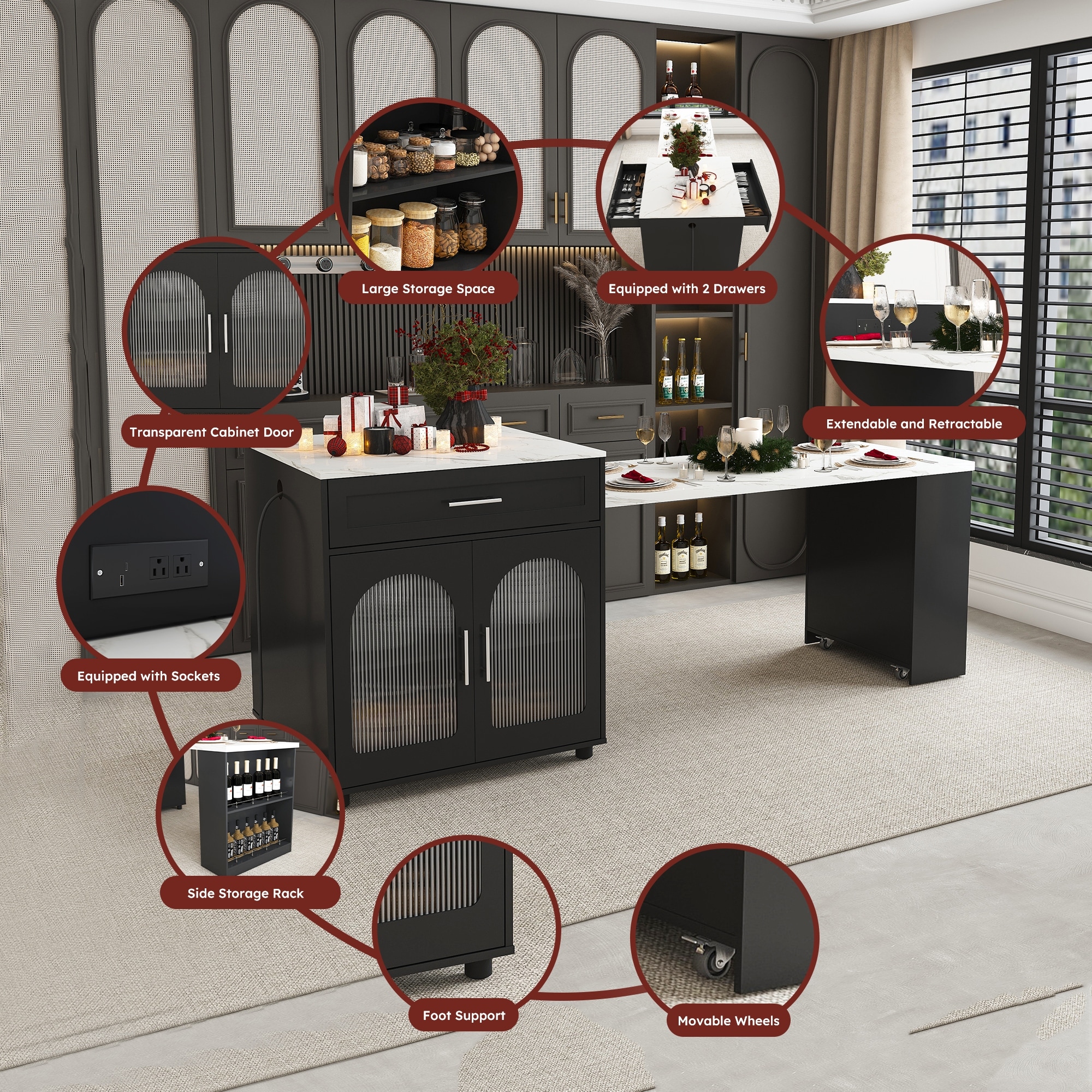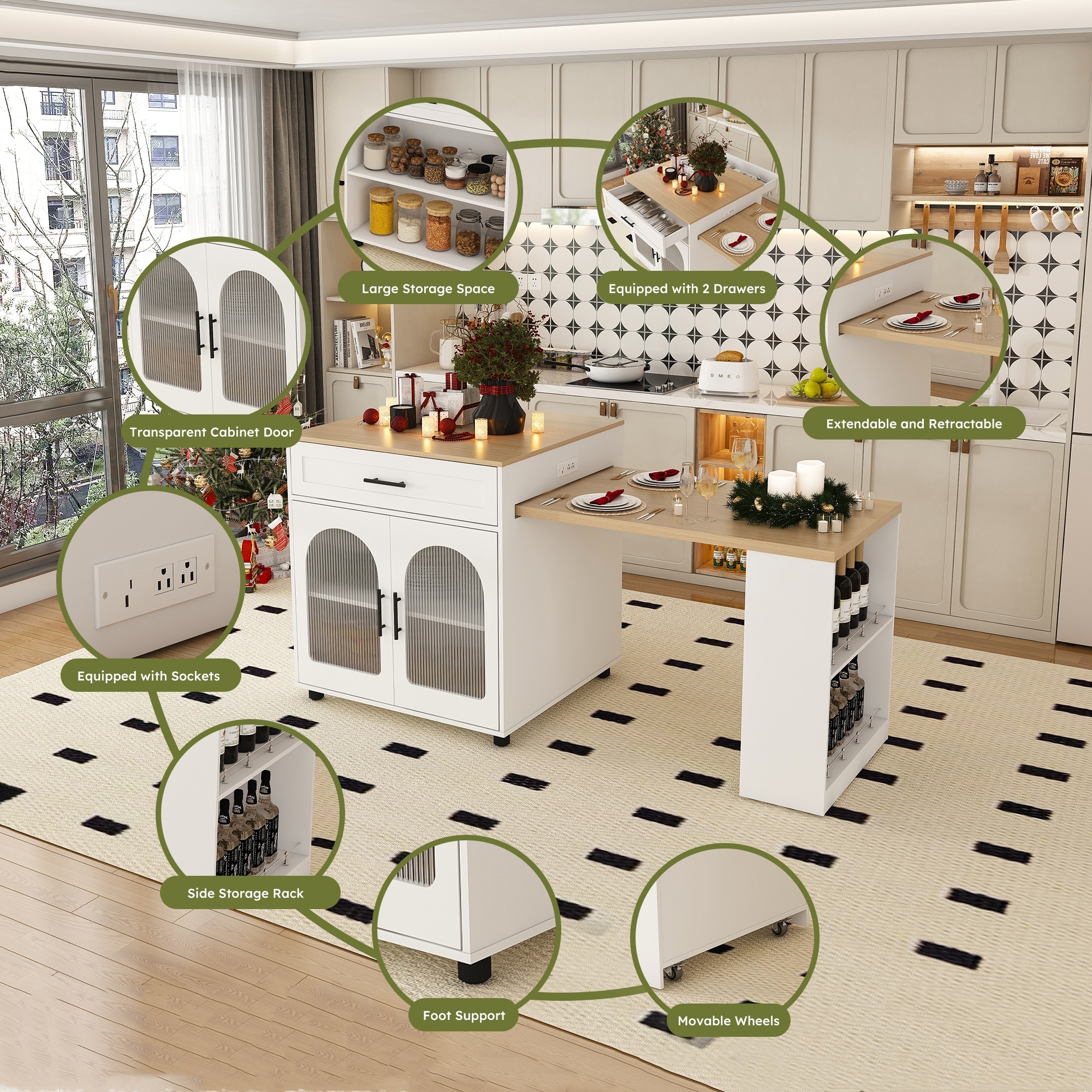 Expandable Kitchen Island with Dining Table, Built-In Power Outlets, Mobile Storage Cart with Cabinet and Drawers for Meal Prep