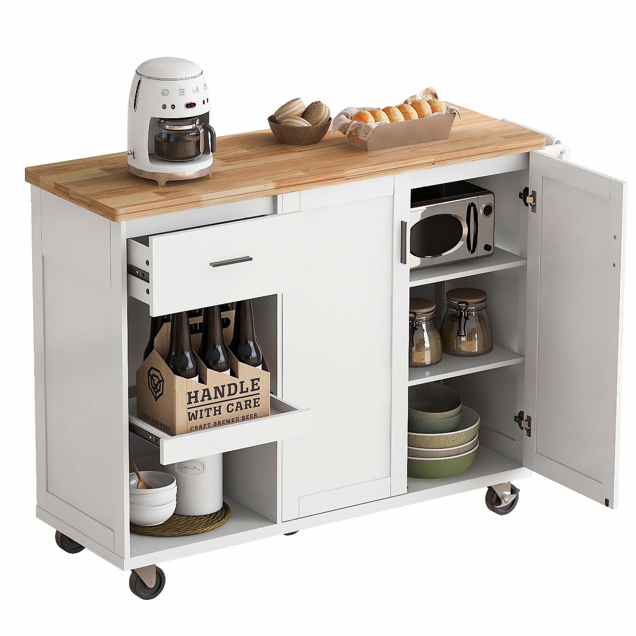 Kitchen Island & Kitchen Cart, Mobile Kitchen Island, Rubber Wood Top, Big & Adjustable Shelf Inside Cabinet