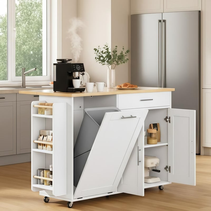 53.9-inch Kitchen Island Cart with Folding Top, Trash Can Storage & 3-Tier Spice Rack