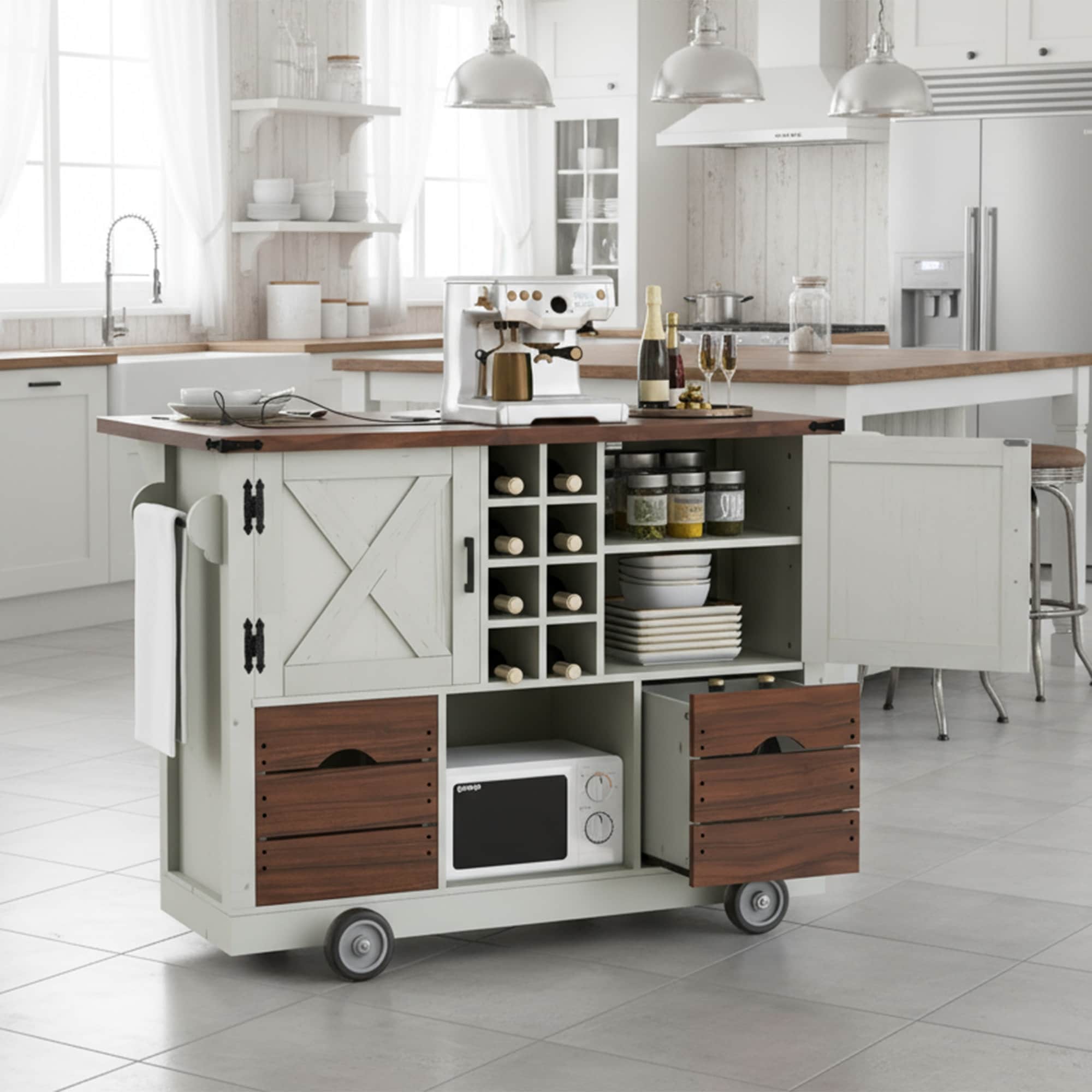 Classic Farmhouse Style Wooden Rolling Kitchen Island with Drop Leaf and Charging Station