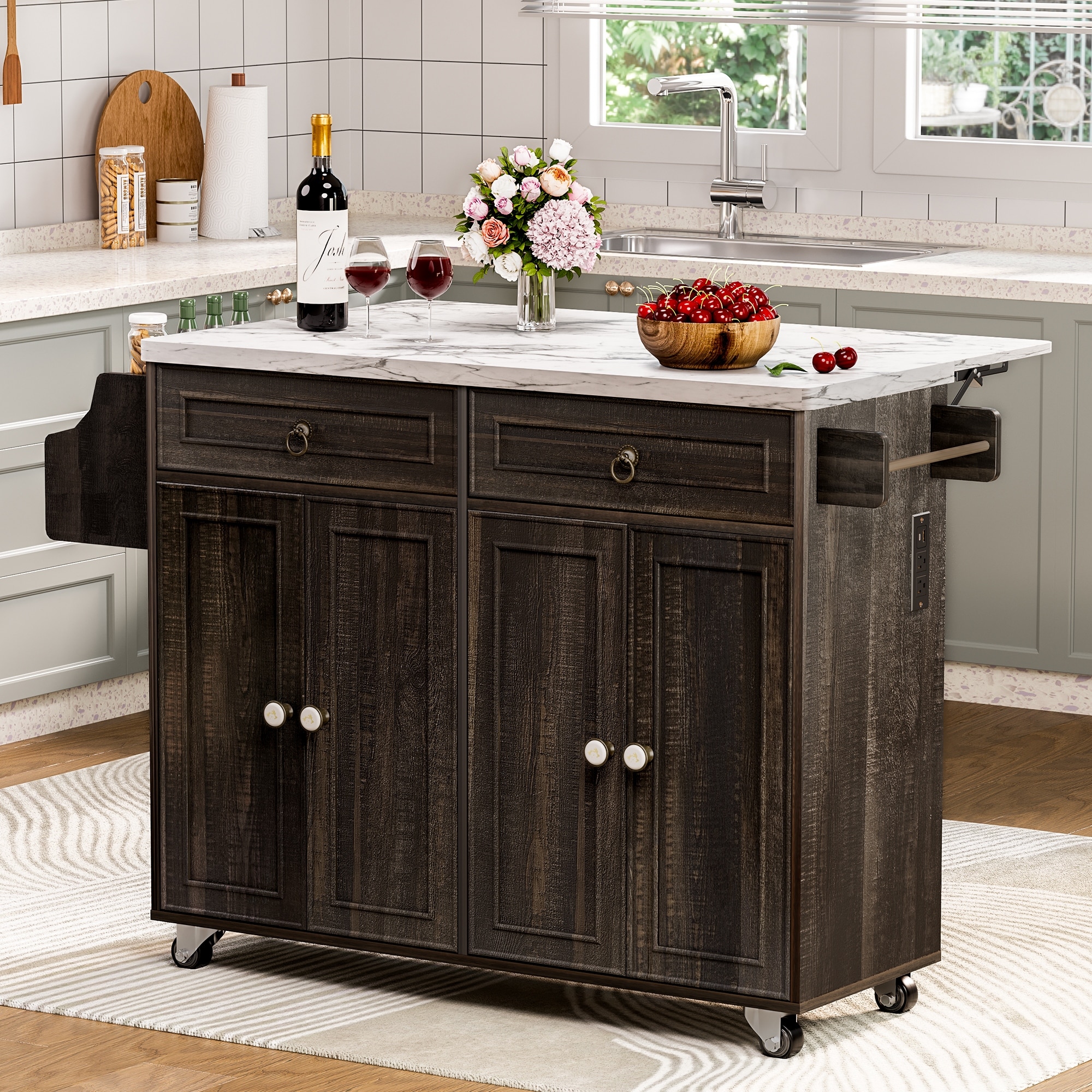 Rustic Rolling Kitchen Island Storage Cabinet with Towel Rack, Knife Holde, Power Outlet & Folding Drop Leaf