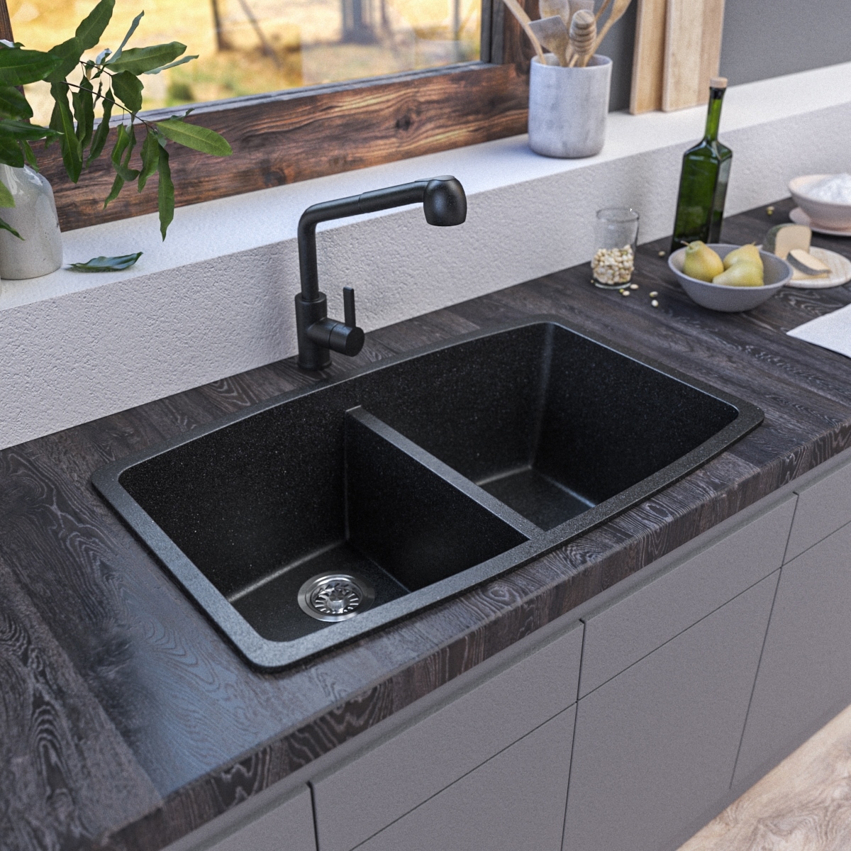 Bluva 33 inch Granite Composite Double Bowl Kitchen Sink with Stainless Steel Drains