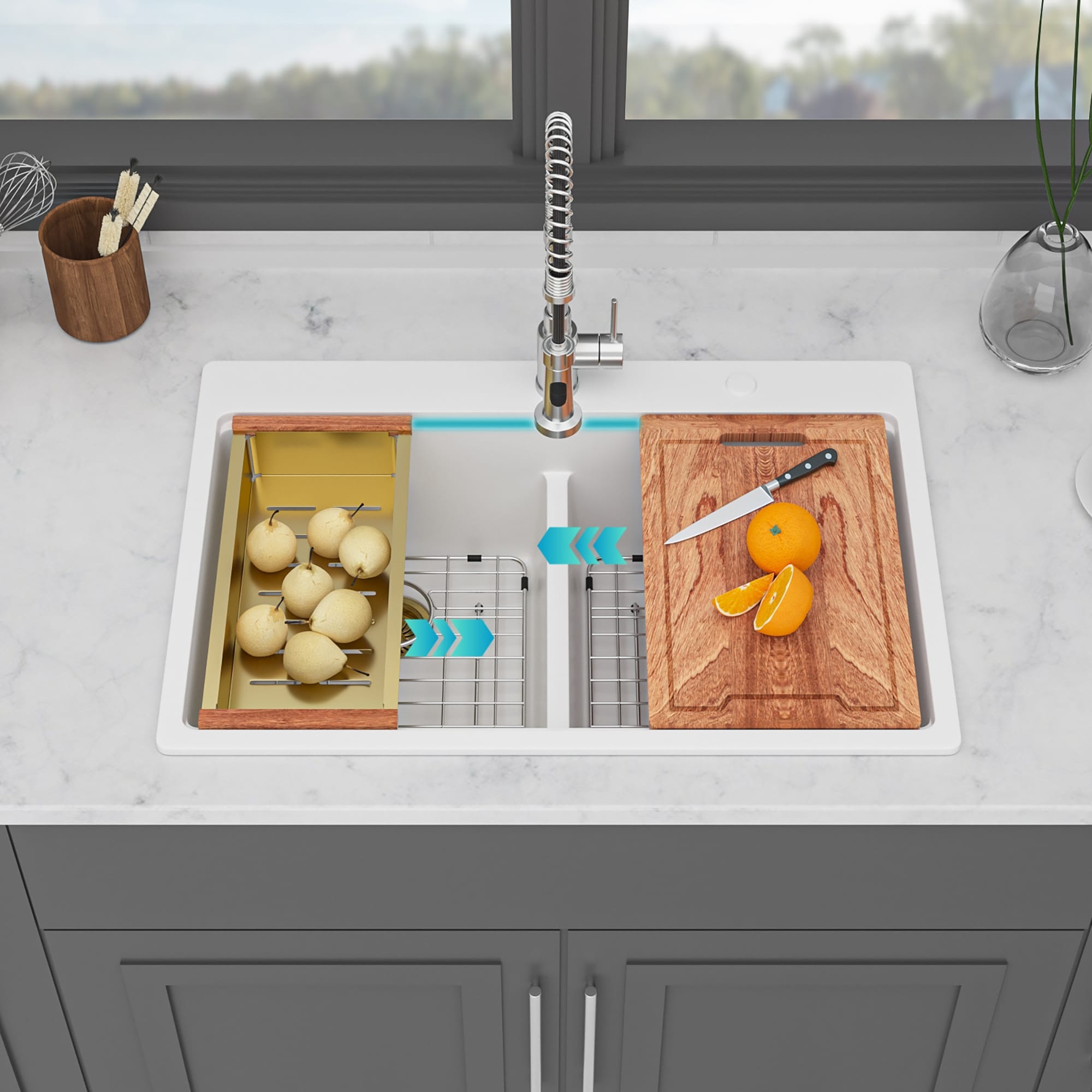 33 Inch. Drop-in Double Bowl White Quartz Kitchen Sink with Workstation