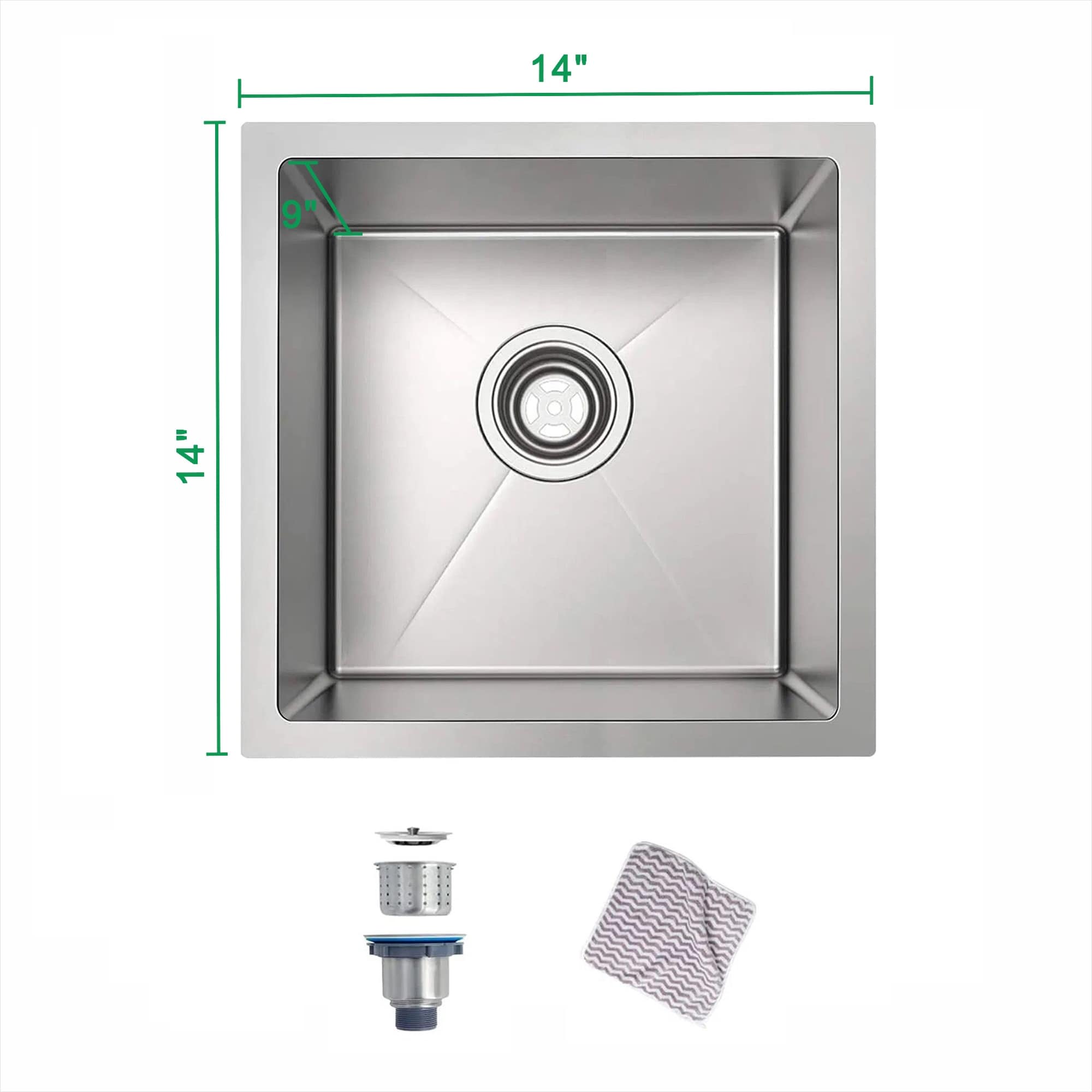 Topcraft Stainless Steel Single Bowl Sink, Undermount Kitchen Sink with Basket Strainer - 14*14*9