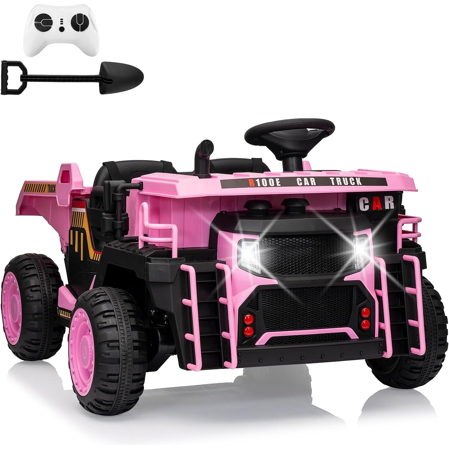 24V 2-Seater Ride-On Dump Truck for Kids, 2WD/4WD Switch, Remote Control, Electric Lift Bed, Shovel, LED Lights, Music
