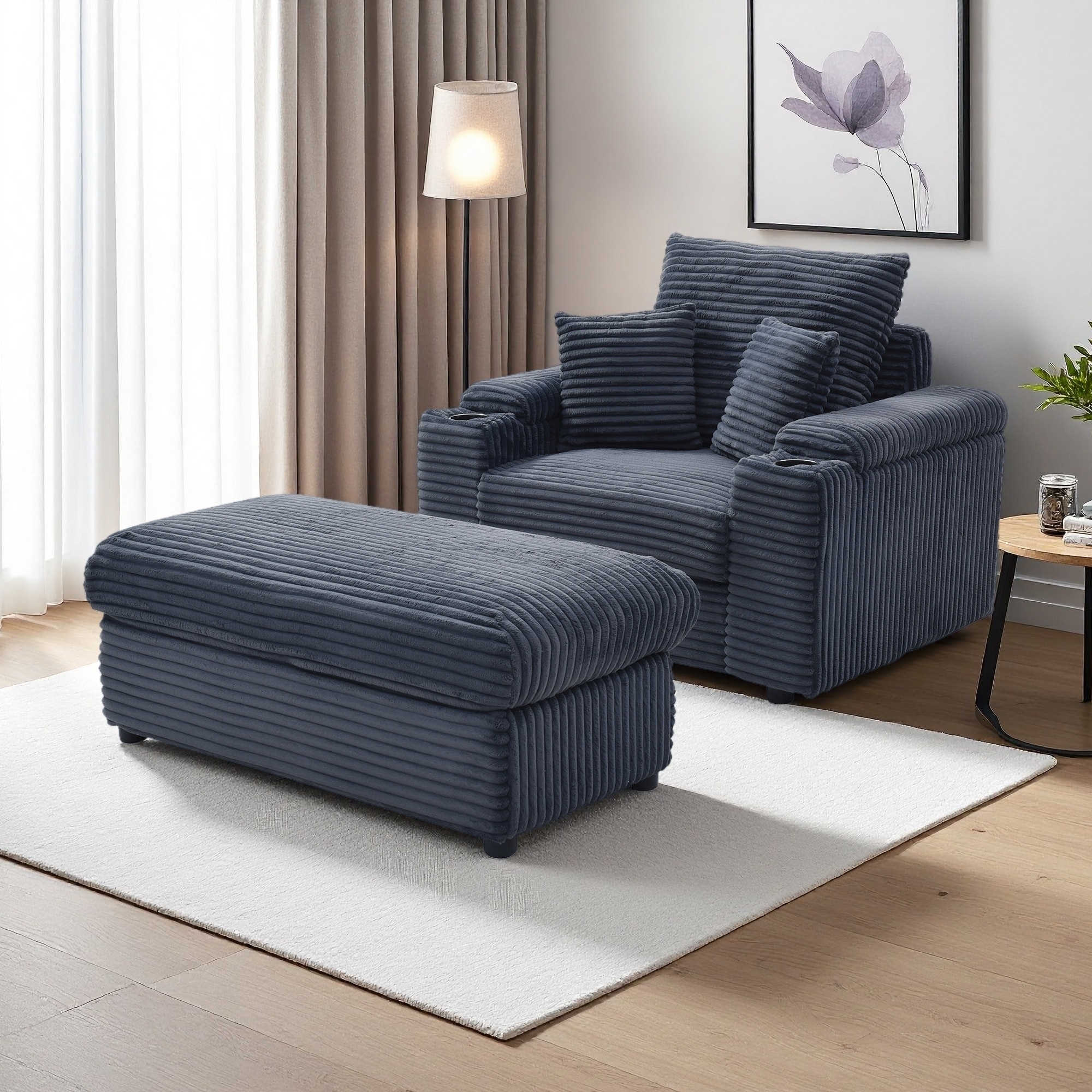 Oversized Corduroy Accent Chair with Ottoman, Wide Arms, Neck Pillow & 2 Cushions