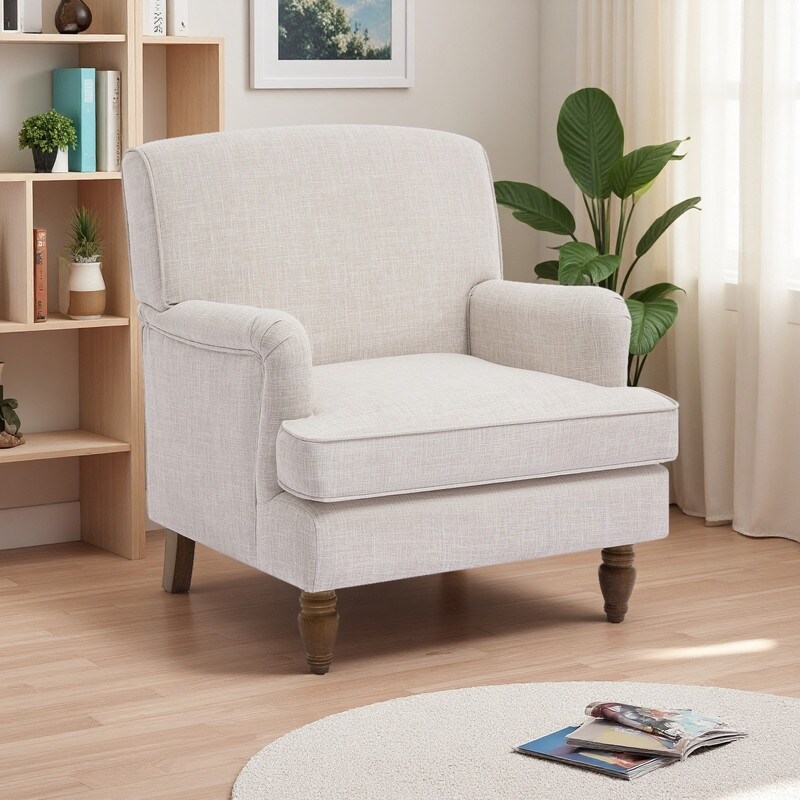 Linen Vintage Armchair with Solid Wood Legs & Rolled Arms
