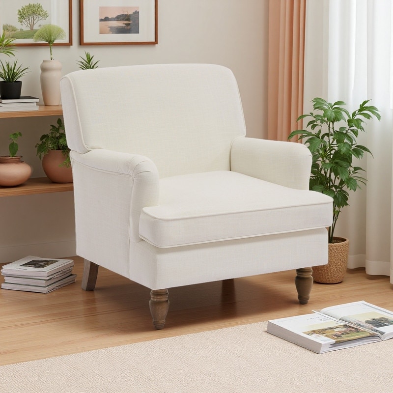 Linen Vintage Armchair with Solid Wood Legs & Rolled Arms