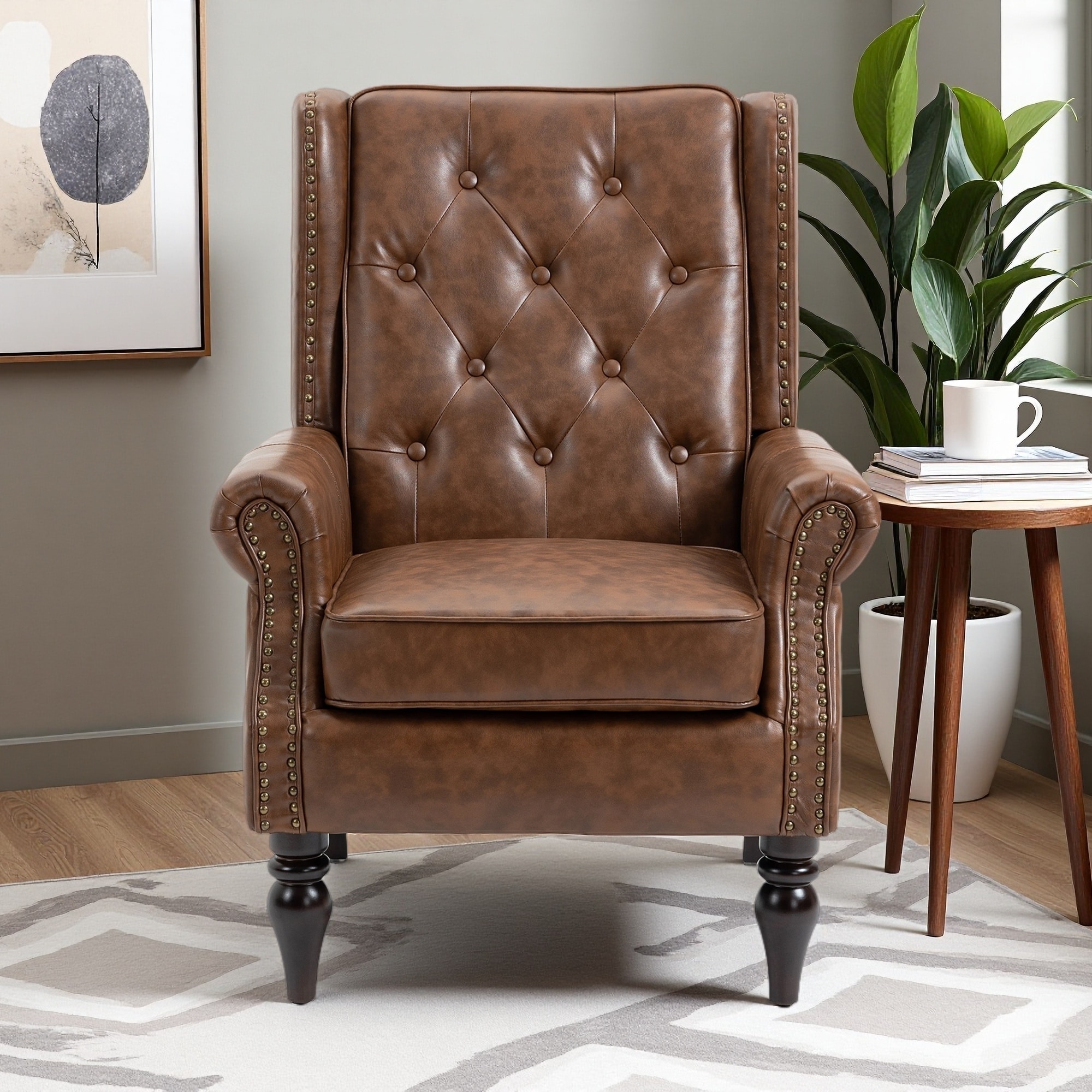 Faux Leather Accent Chair with Wide Backrest & Sturdy Wood Legs