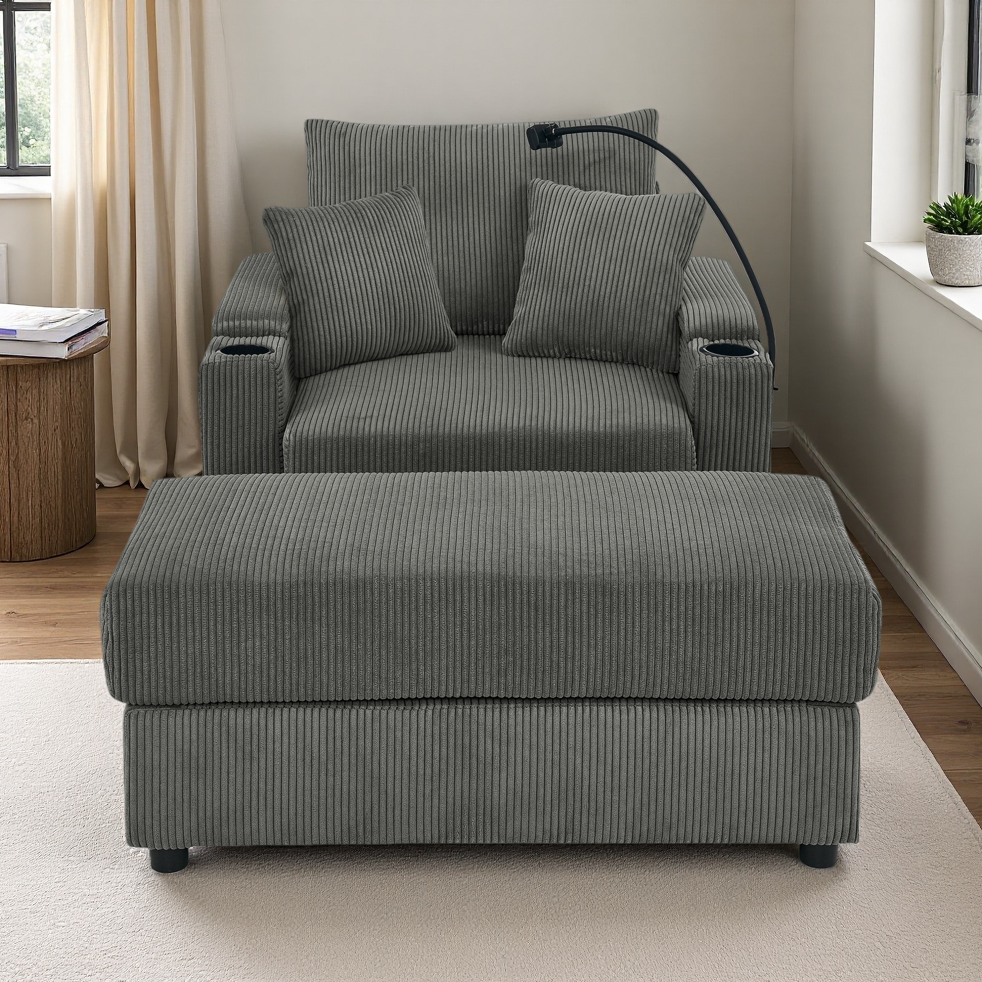 Modern Corduroy Deep Seat Chair with Ottoman, Storage, Cup Holders & Phone Slot for Living Room
