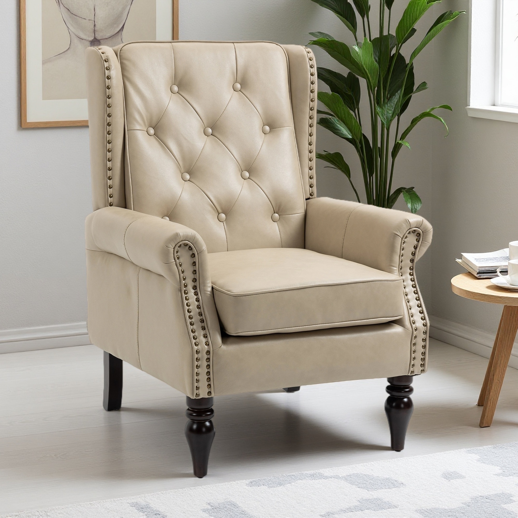 Faux Leather Accent Chair with Wide Backrest & Sturdy Wood Legs