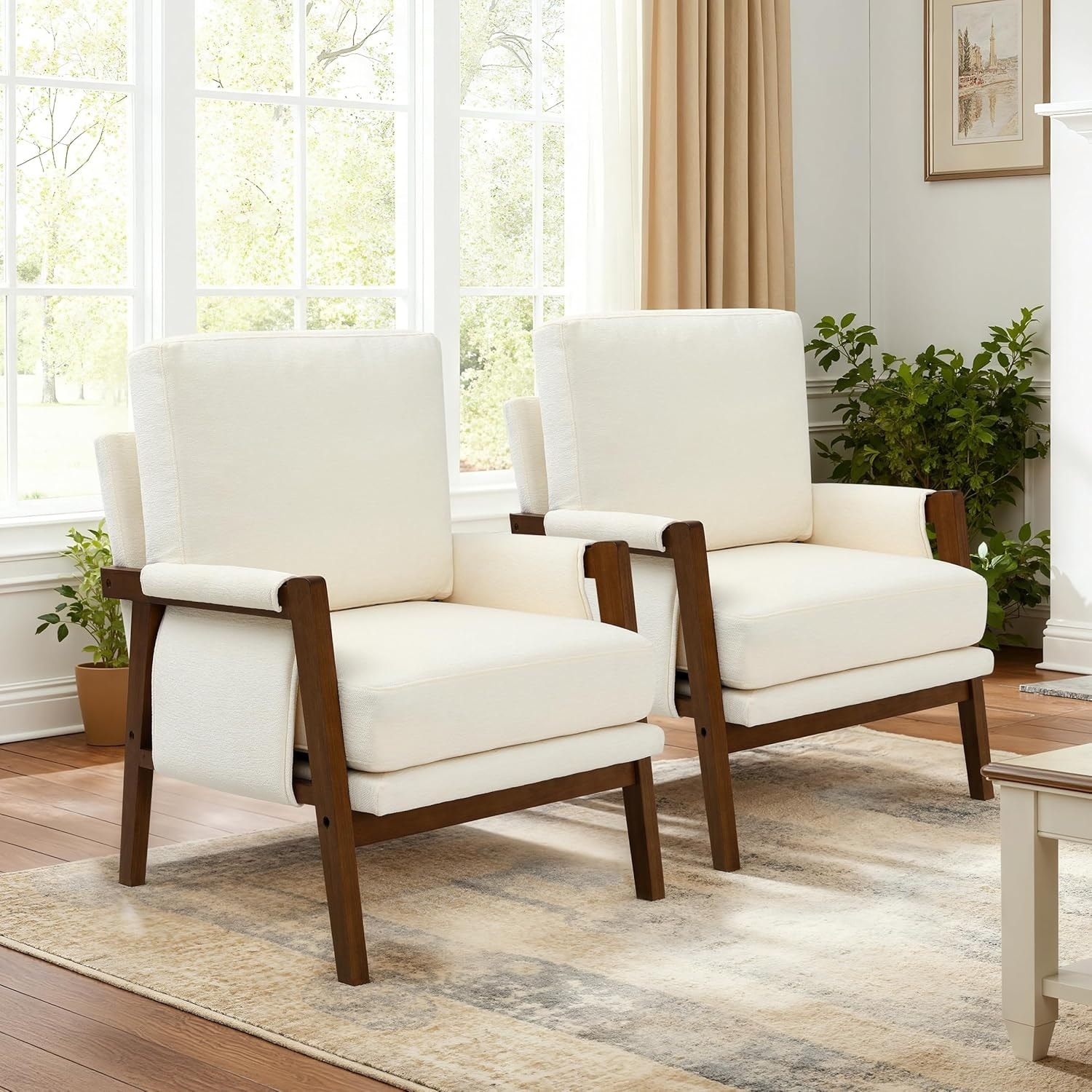 Accent Chairs for Living Room Set of 2, Modern Arm Chairs for Bedroom, Wooden Upholstered Mid Century Accent Chairs, Cream White