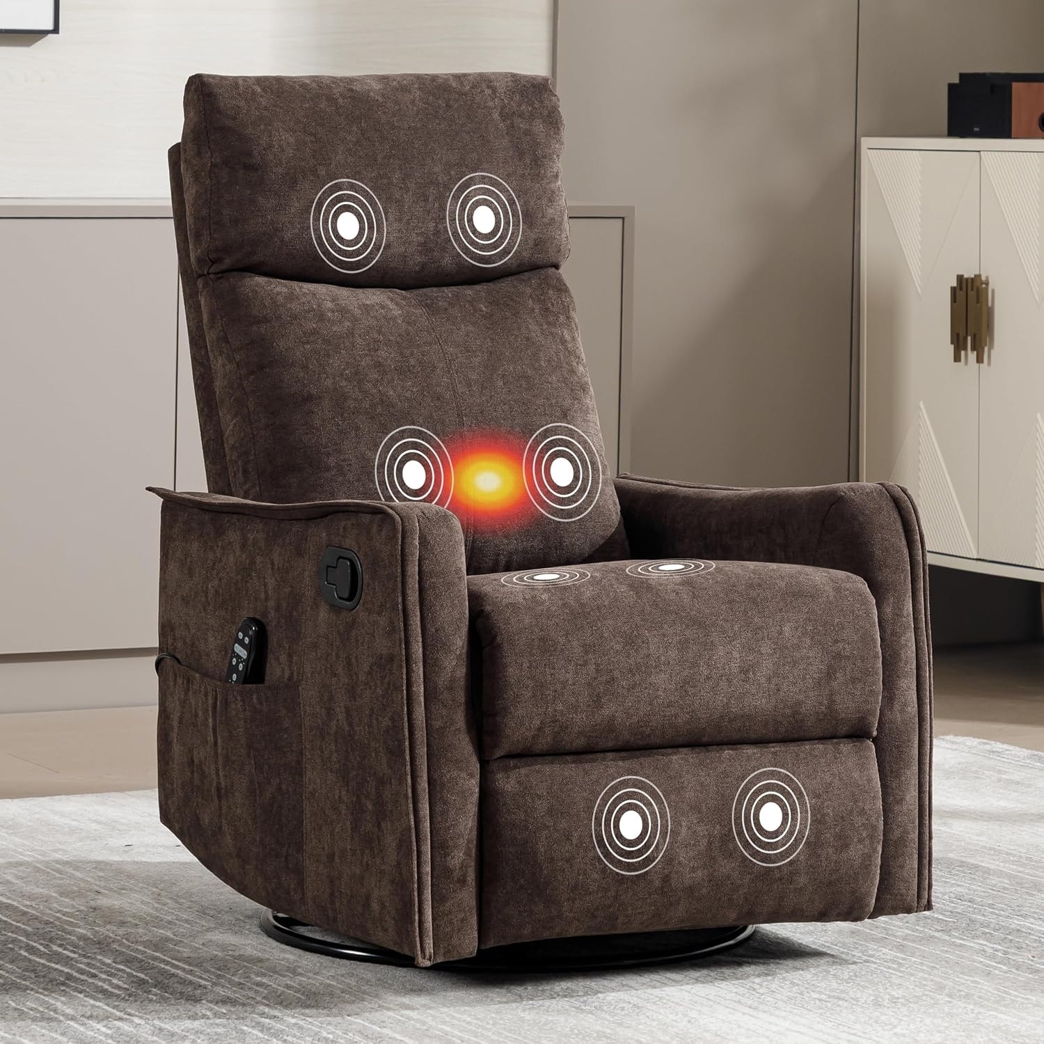 Massage Rocker Swivel Recliner Chair with Lumbar Heating, Technical Flannel Fabric Glider for Living Room (Brown)
