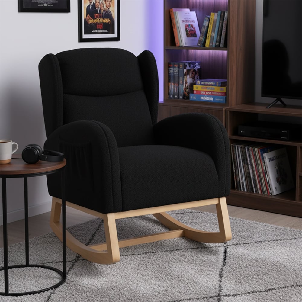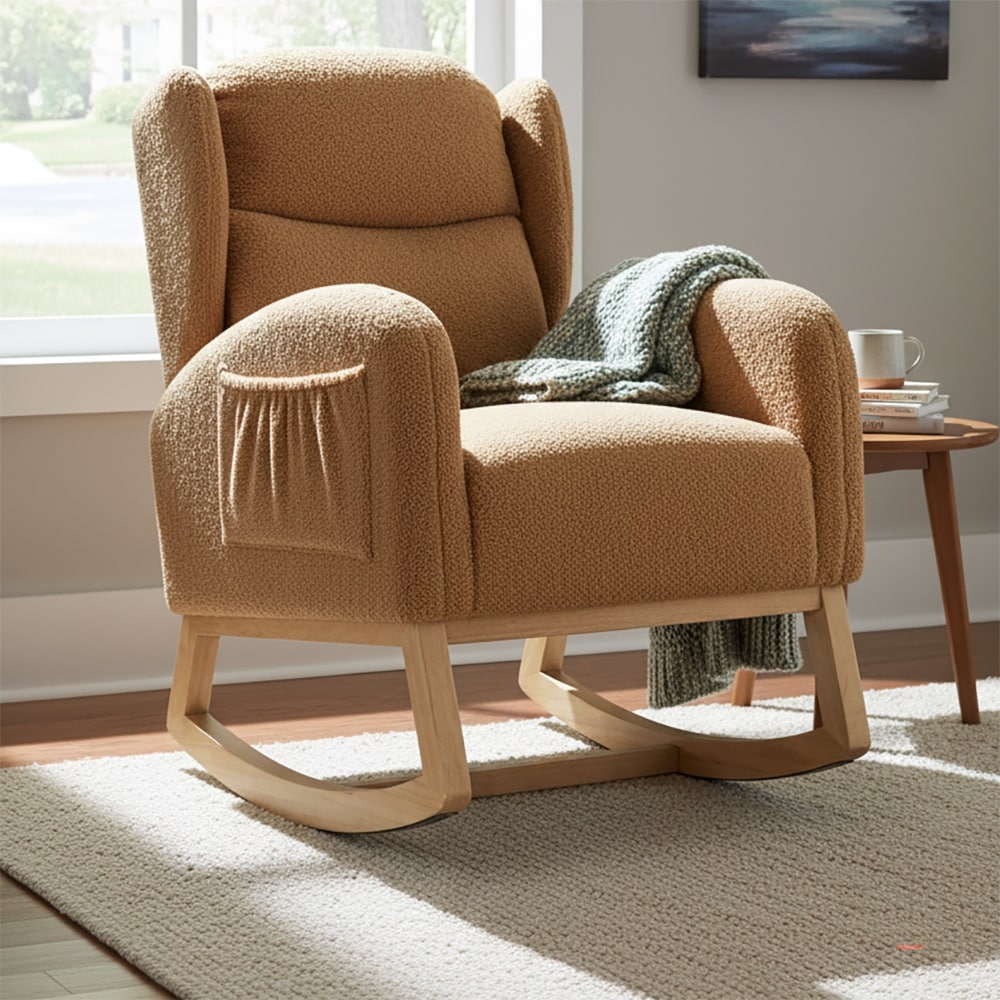 Classic Teddy Fabric Upholstered Wingback Rocking Chair with A Storage Pocket