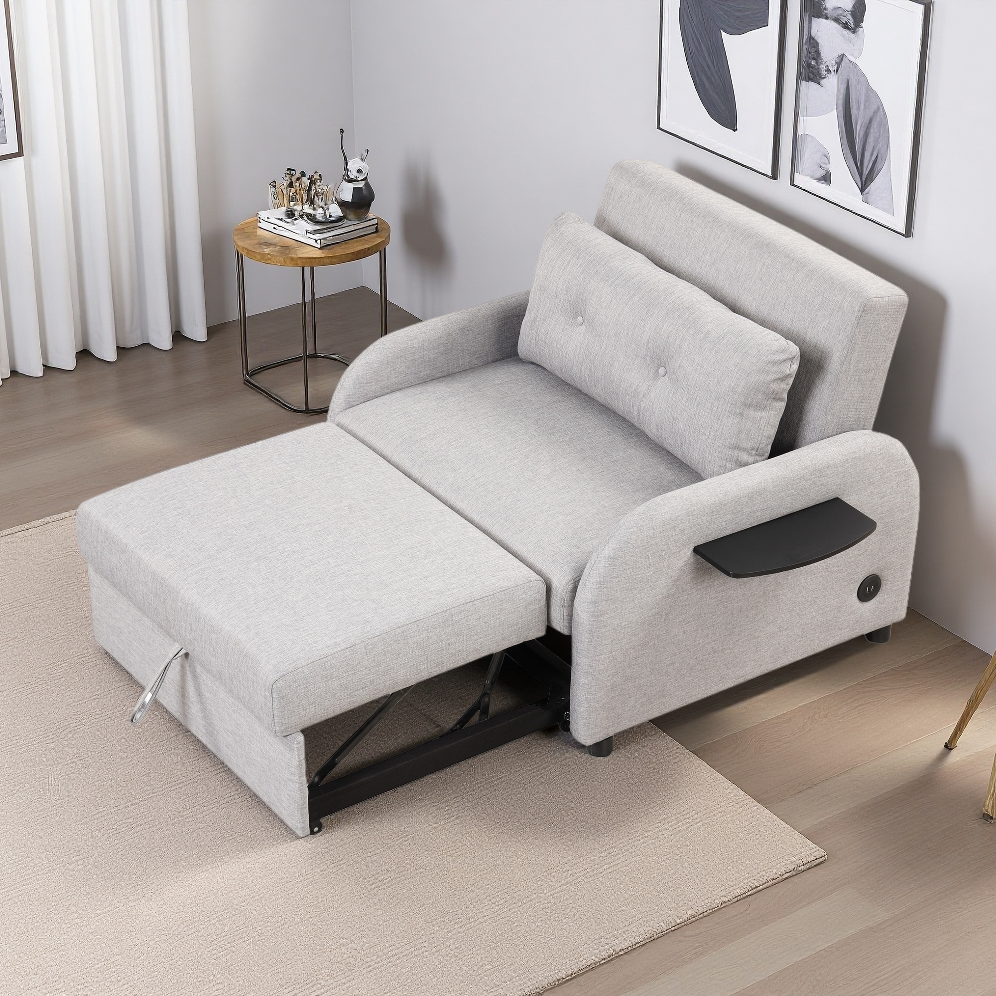 42.9" Linen Pull-Out 3-in-1 Sleeper Chair with Wing Tables & USB Ports