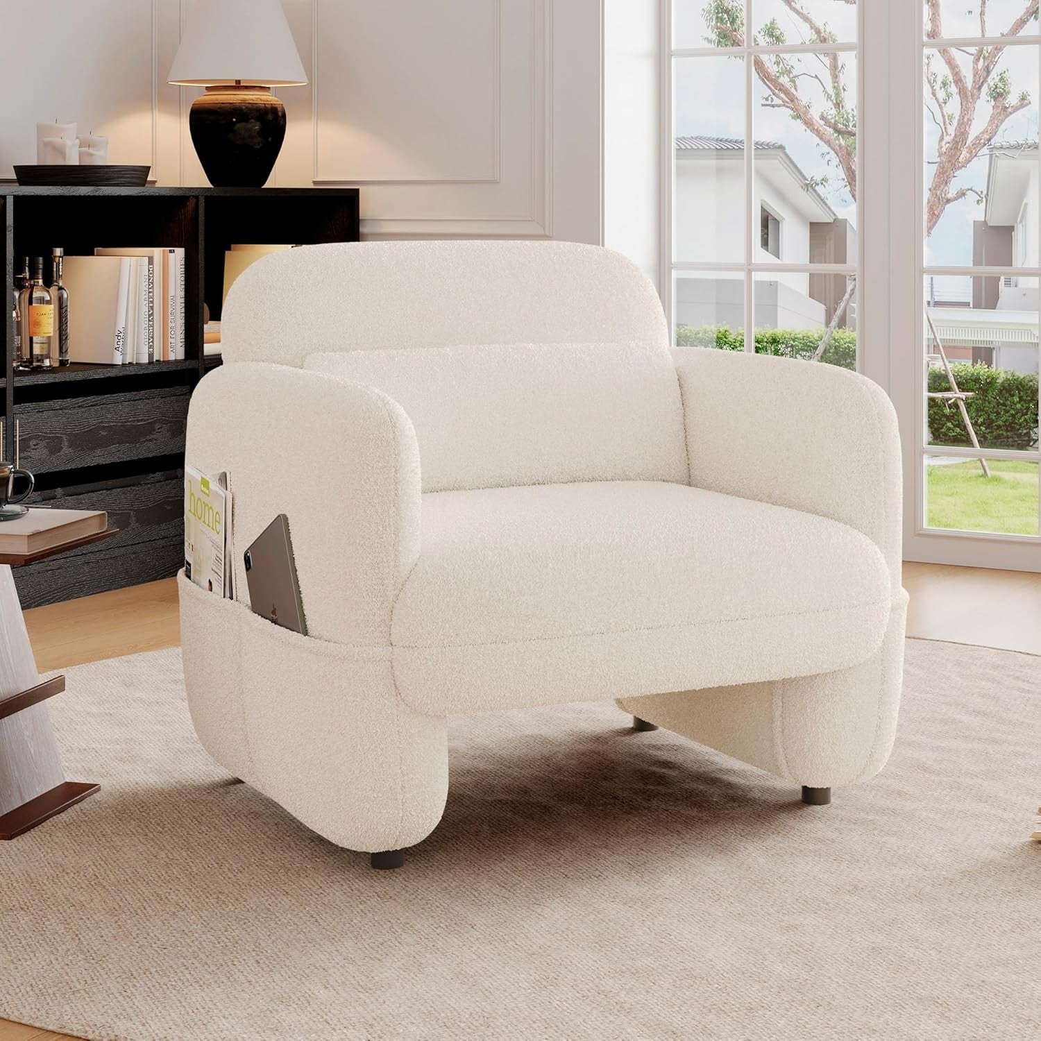 Oversized Beige Sherpa Fabric Accent Chair with Waist Pillow for Living Room and Bedroom