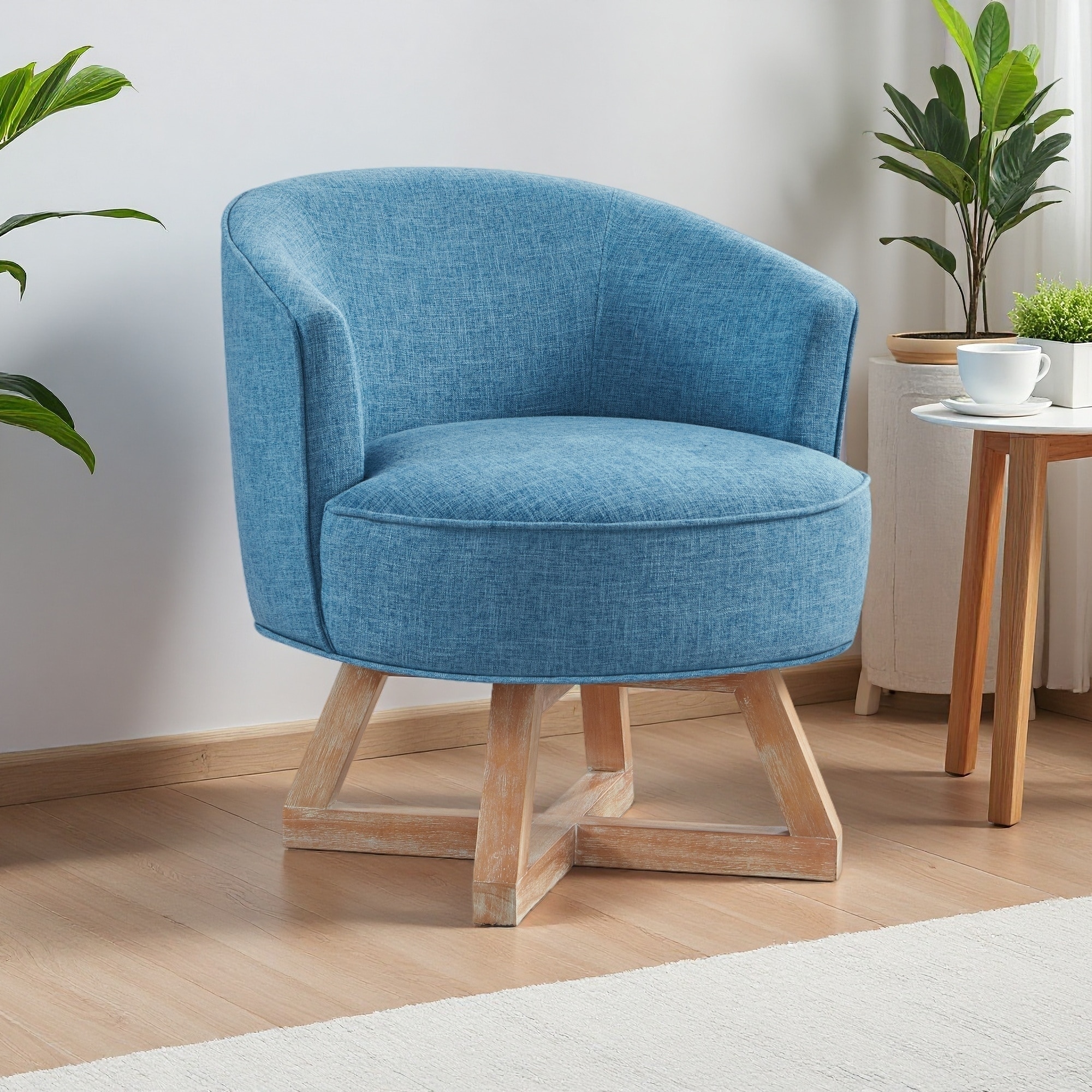 Linen Upholstered Swivel Lounge Chair with 360° Rotation, Curved Back & Solid Wood Cross Base