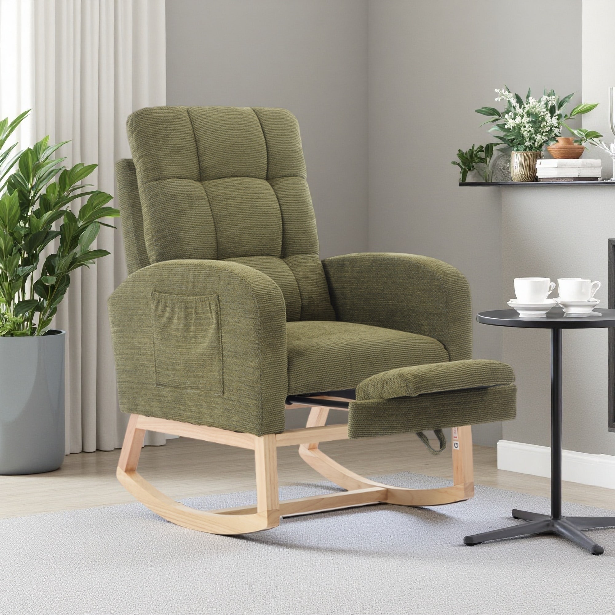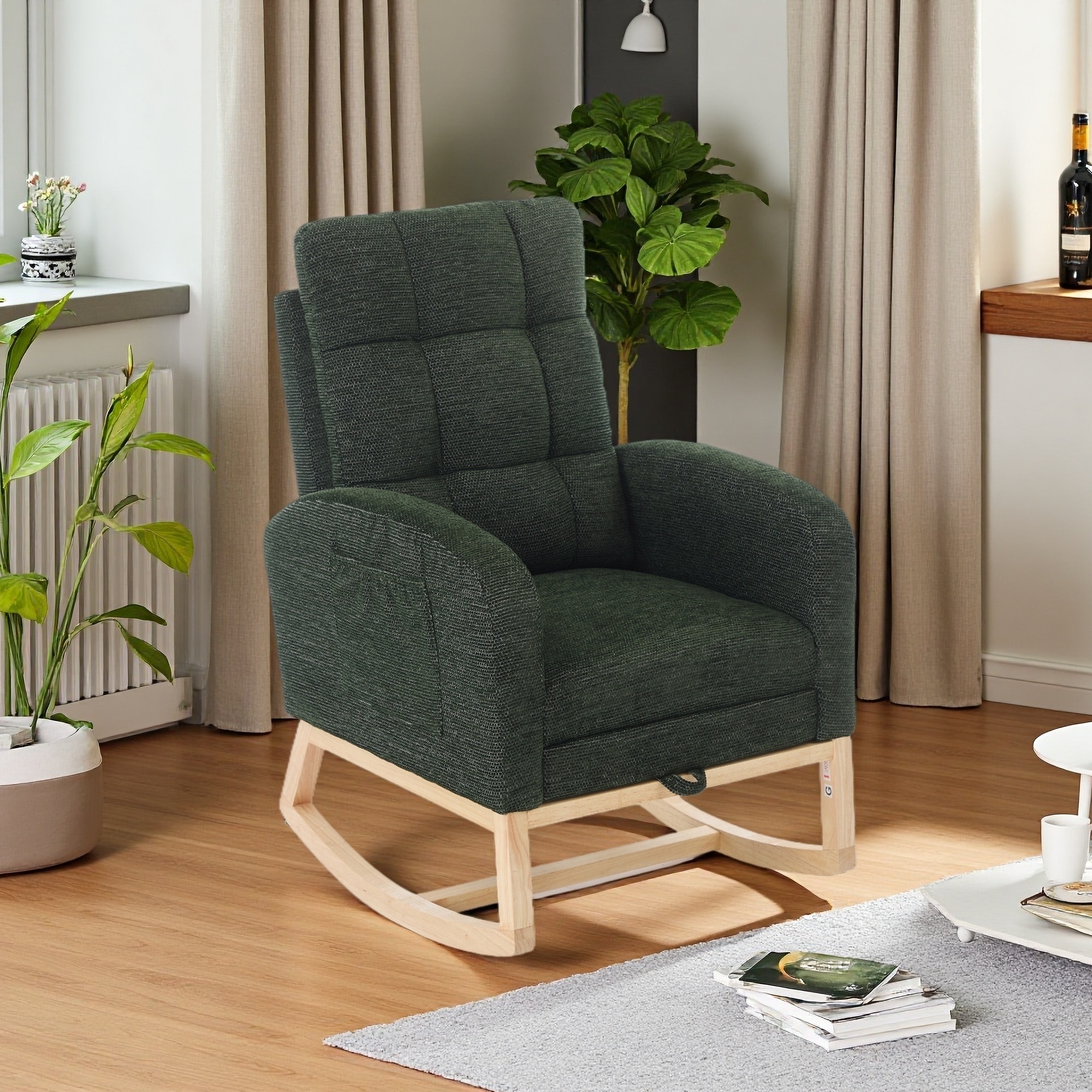 Polyester Rocking Chair with Solid Wood Legs, High Backrest & Side Pocket for Living Room/Bedroom