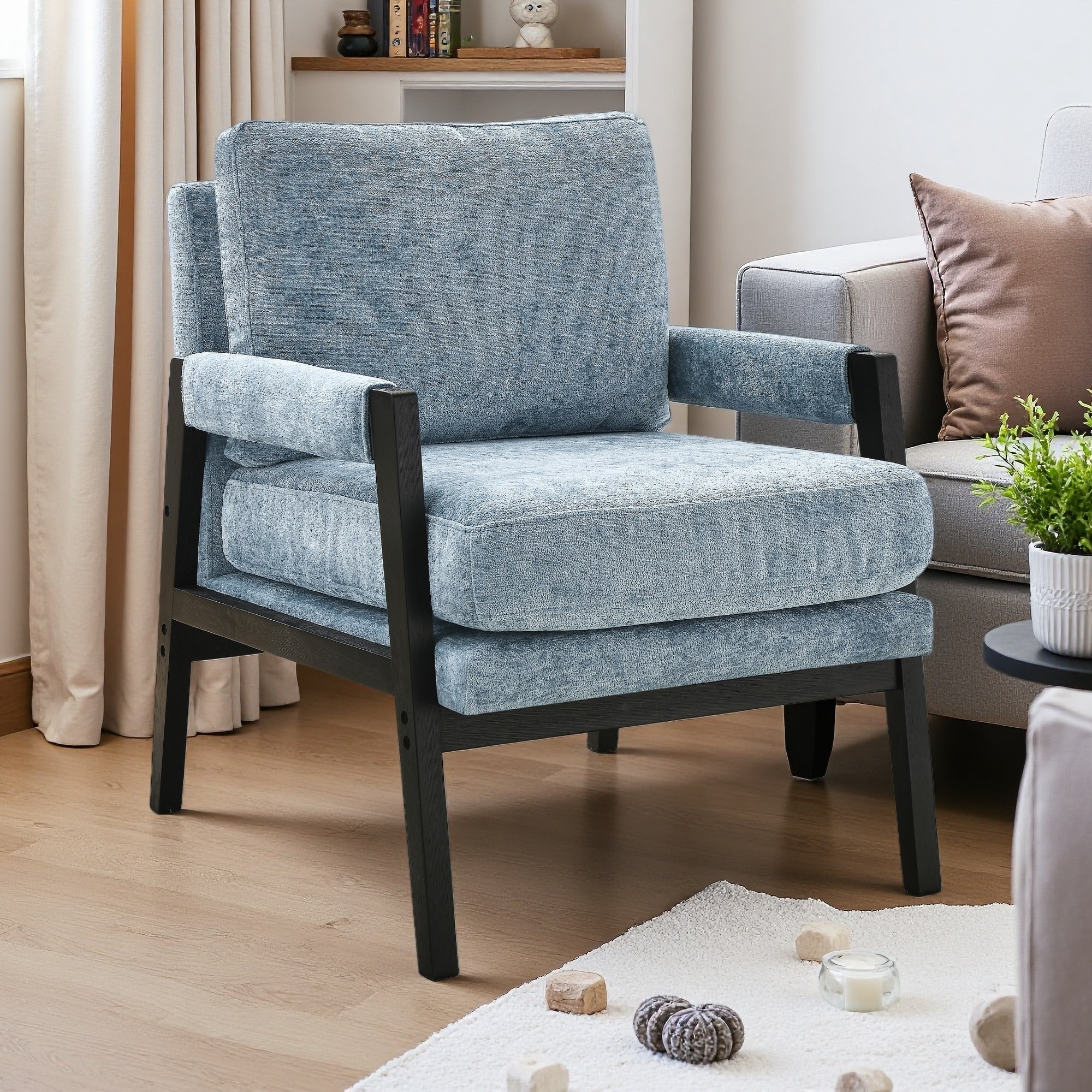Chenille Mid-Century Accent Armchair with Removable Back Cushion & Solid Acacia Wood Frame