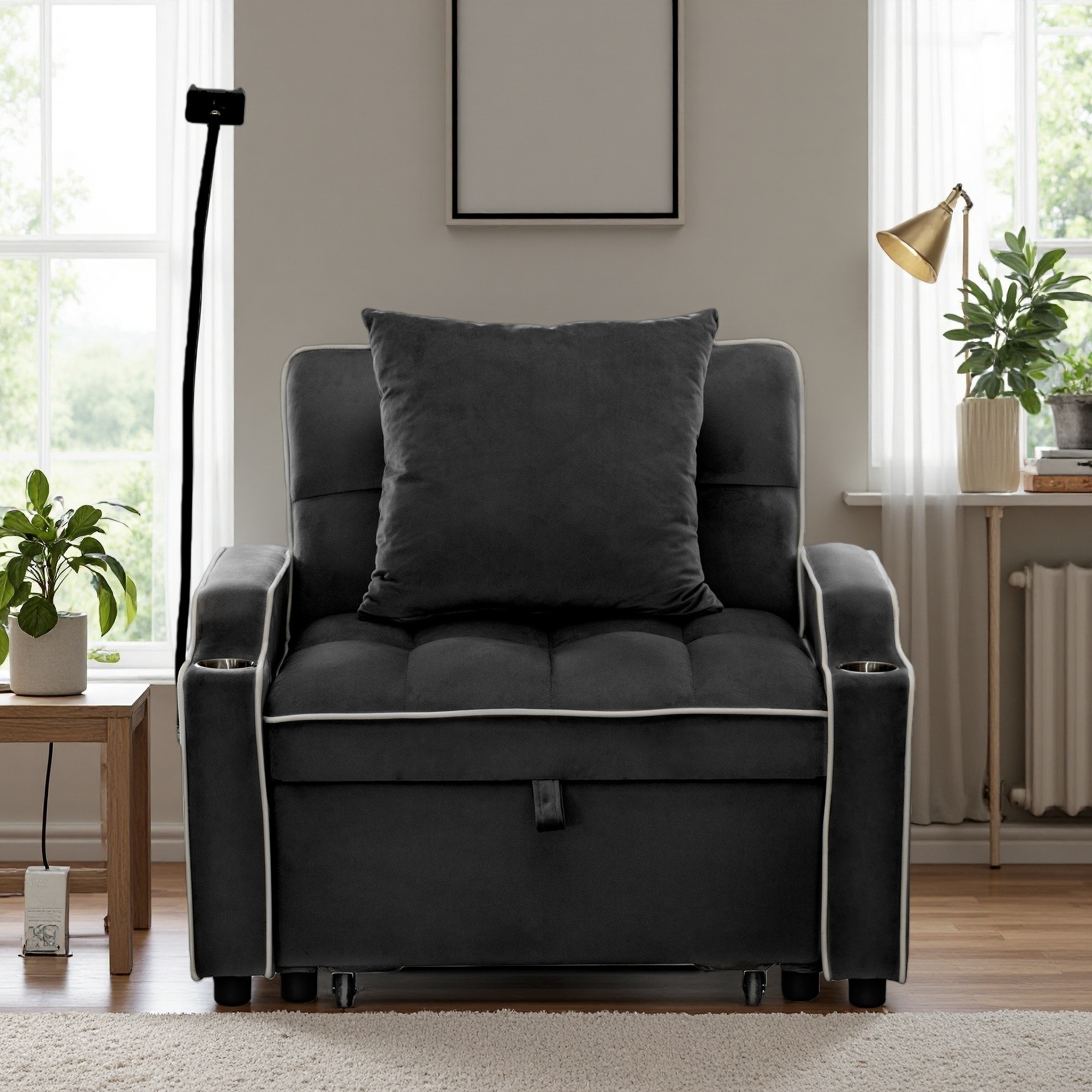 Velvet Convertible Sofa Chair Bed with Phone Holder, USB Ports and Cup Holders
