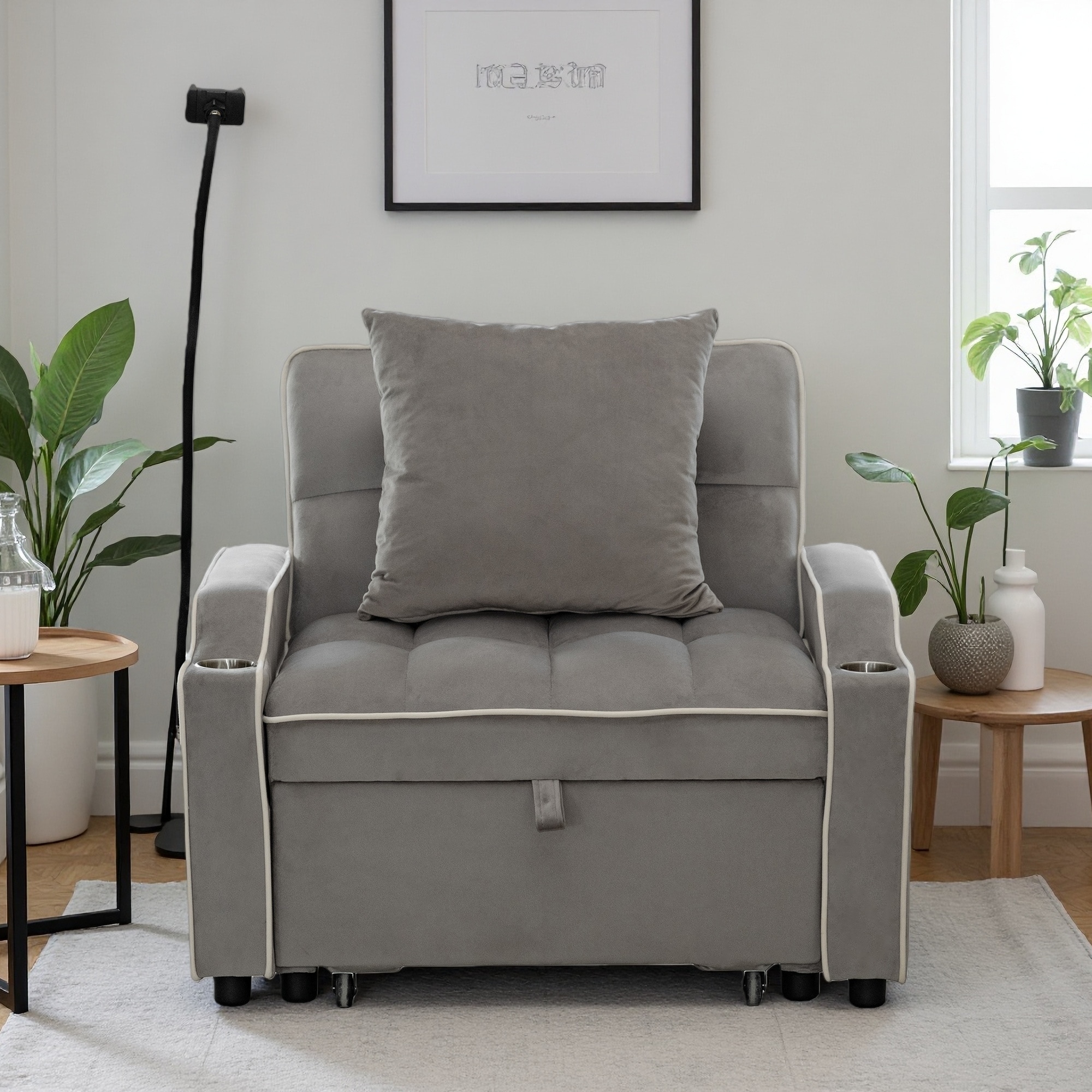 Velvet Convertible Sofa Chair Bed with Phone Holder, USB Ports and Cup Holders