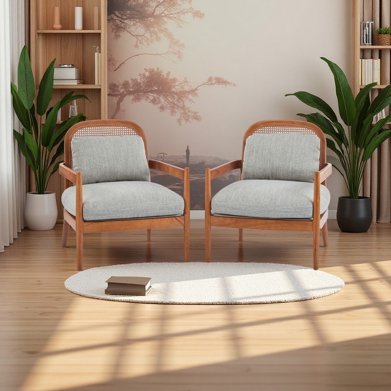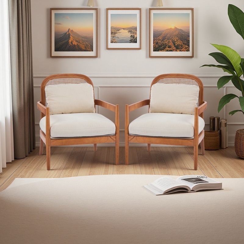 Rattan Mid-Century Accent Chairs with Cushions (Set of 2)