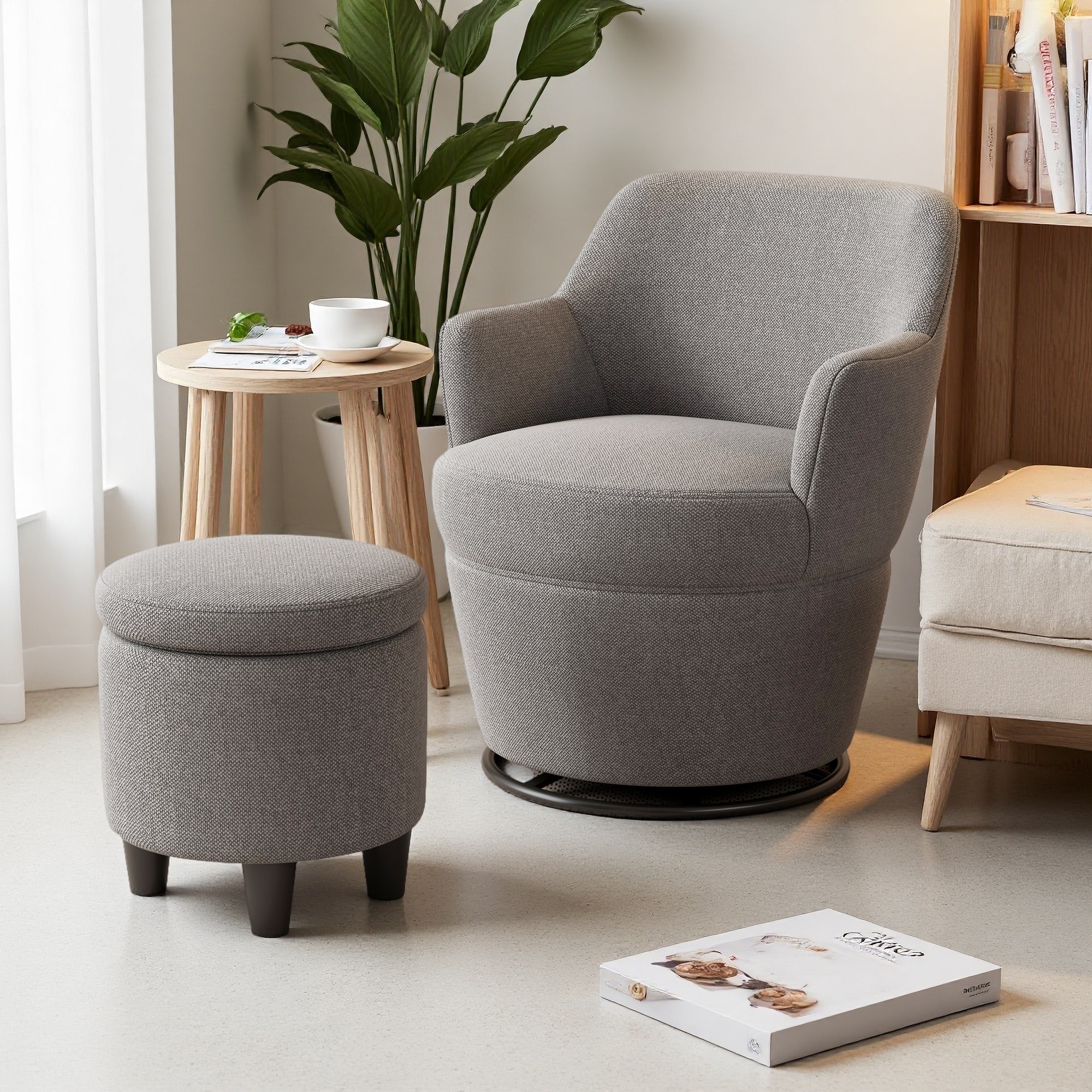 360° Swivel Accent Chair with Ottoman, Burlap Fabric Sofa with Nail Trim, Metal Frame for Living Room