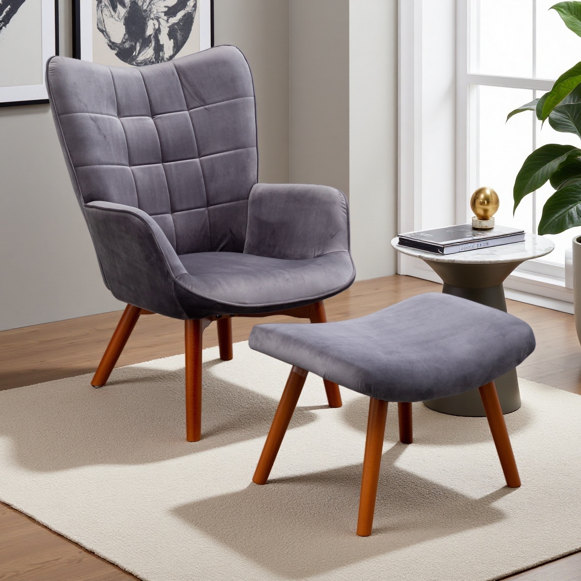 Silky Velvet Accent Chair with Button Tufting, Matching Ottoman & Plush Cushion for Living Room