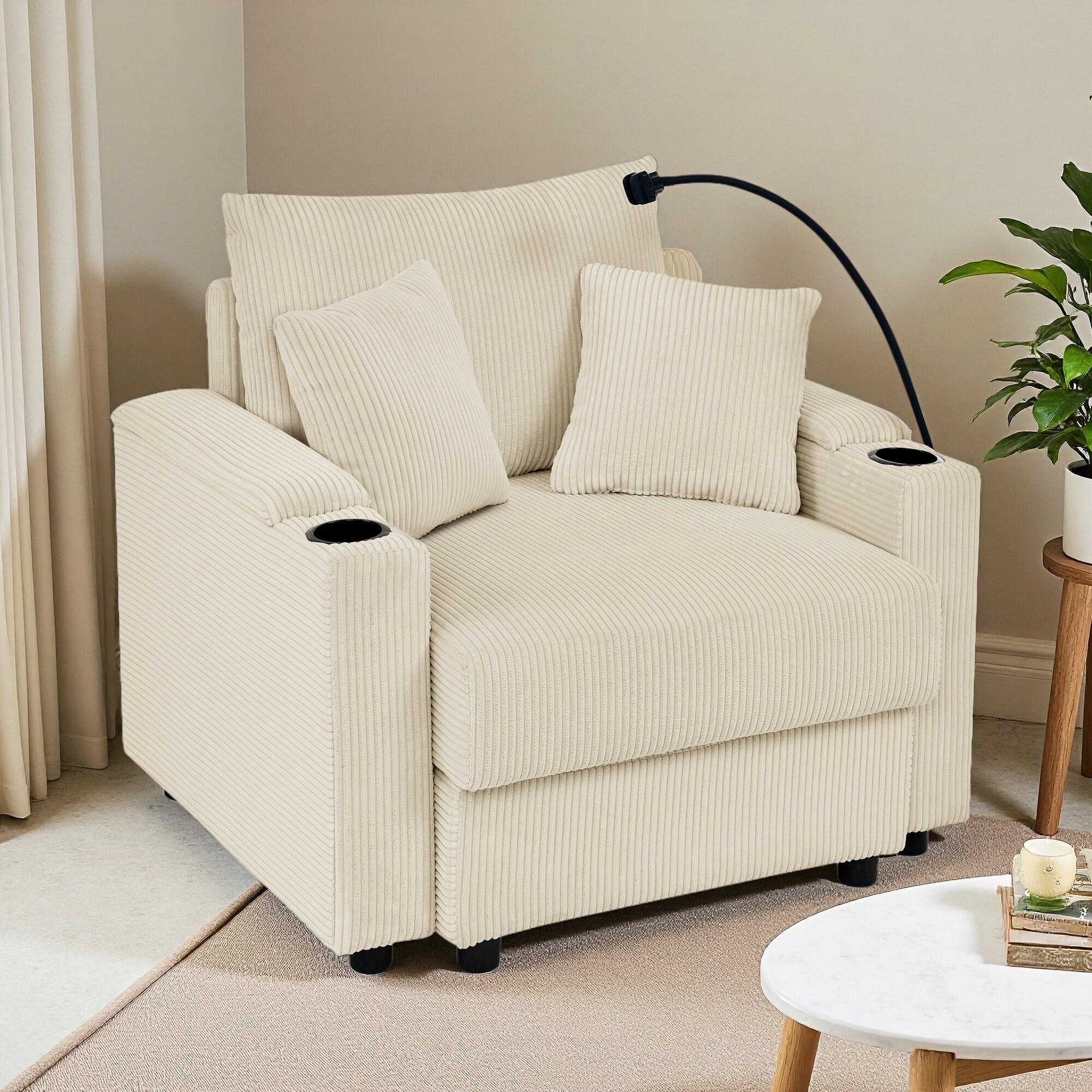 Oversized Fabric Accent Chair with Storage Arms, Cushion & Cup Holders