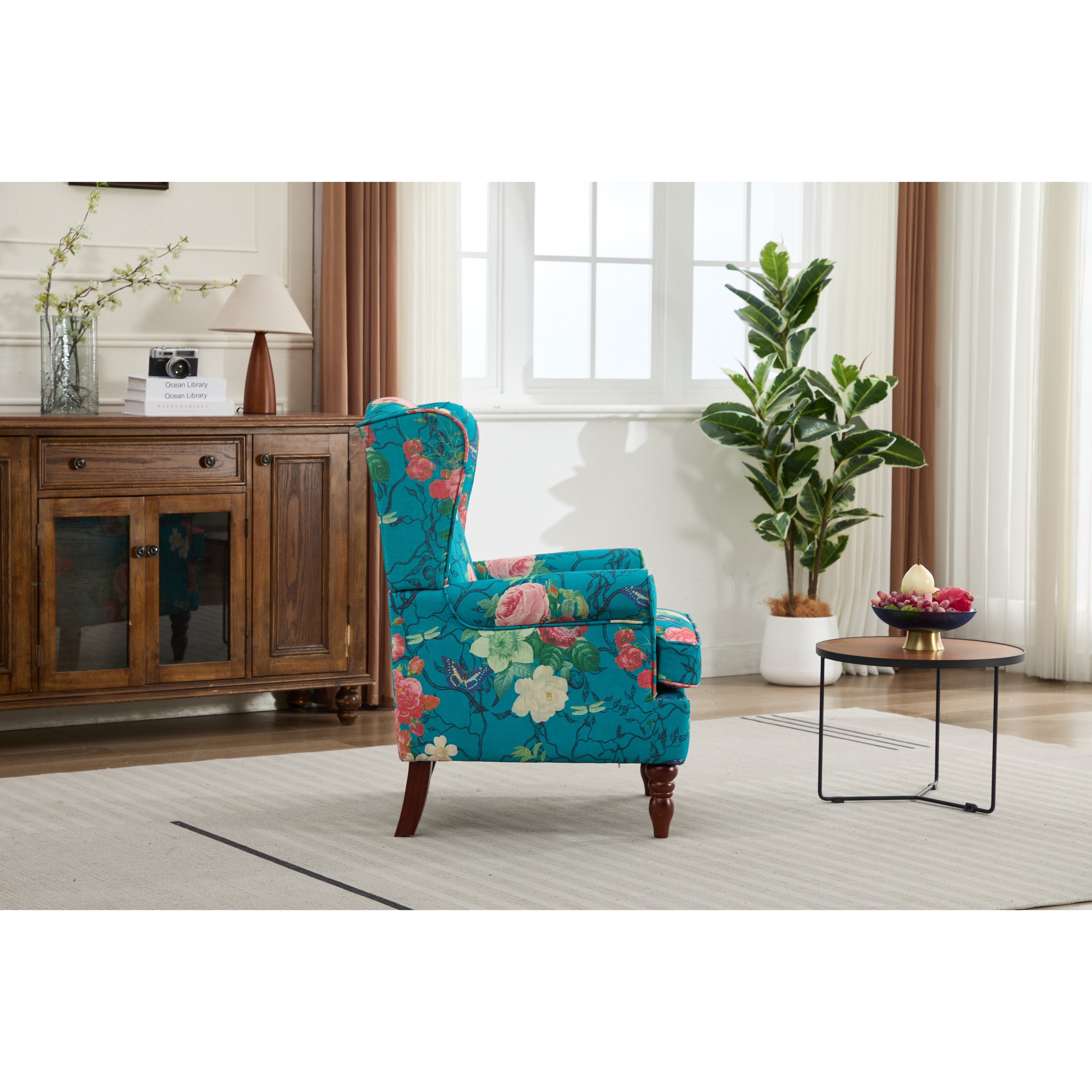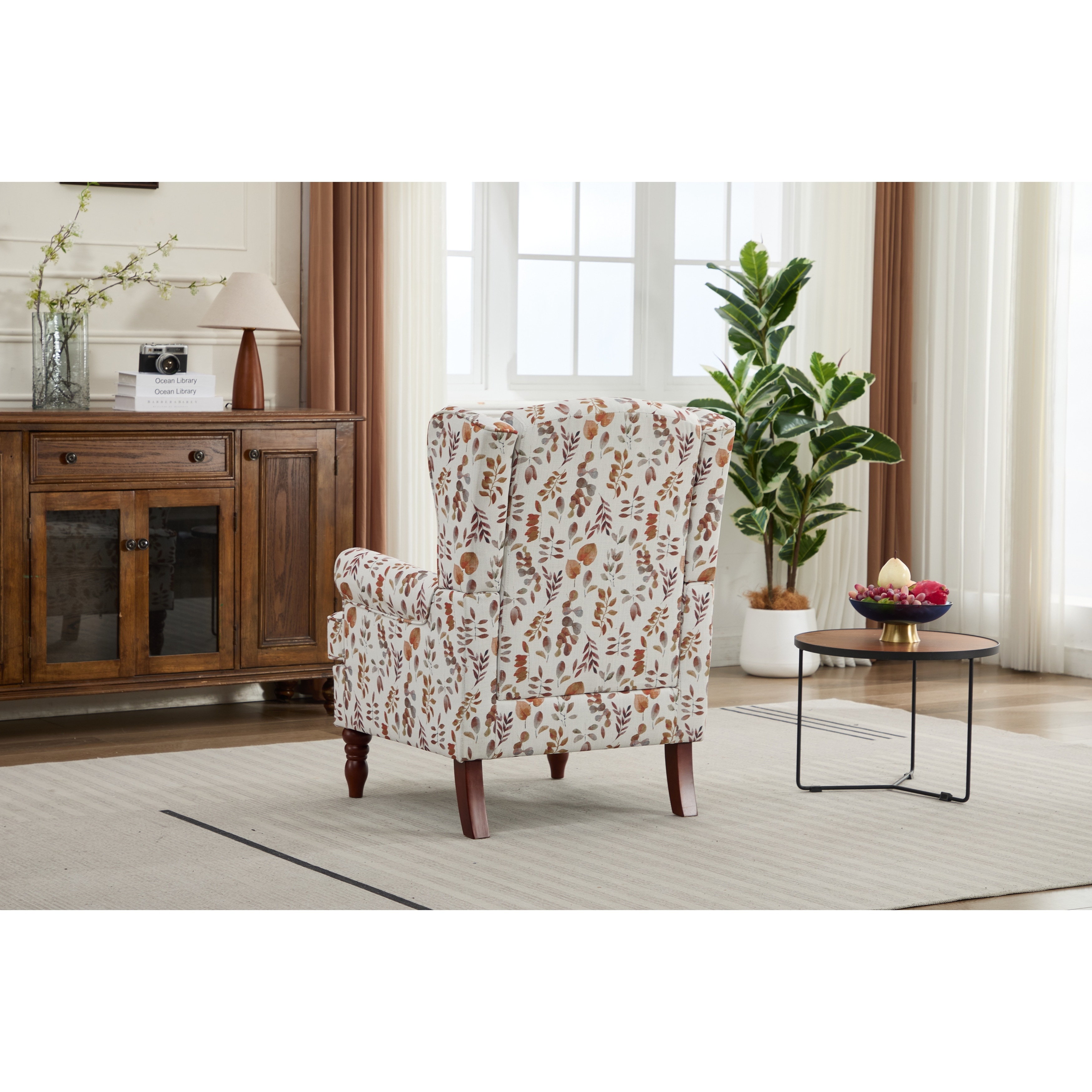 Modern Accent Chair with Retro Wood Legs, Comfy Upholstered Armchair, Floral Design Single Sofa Chair