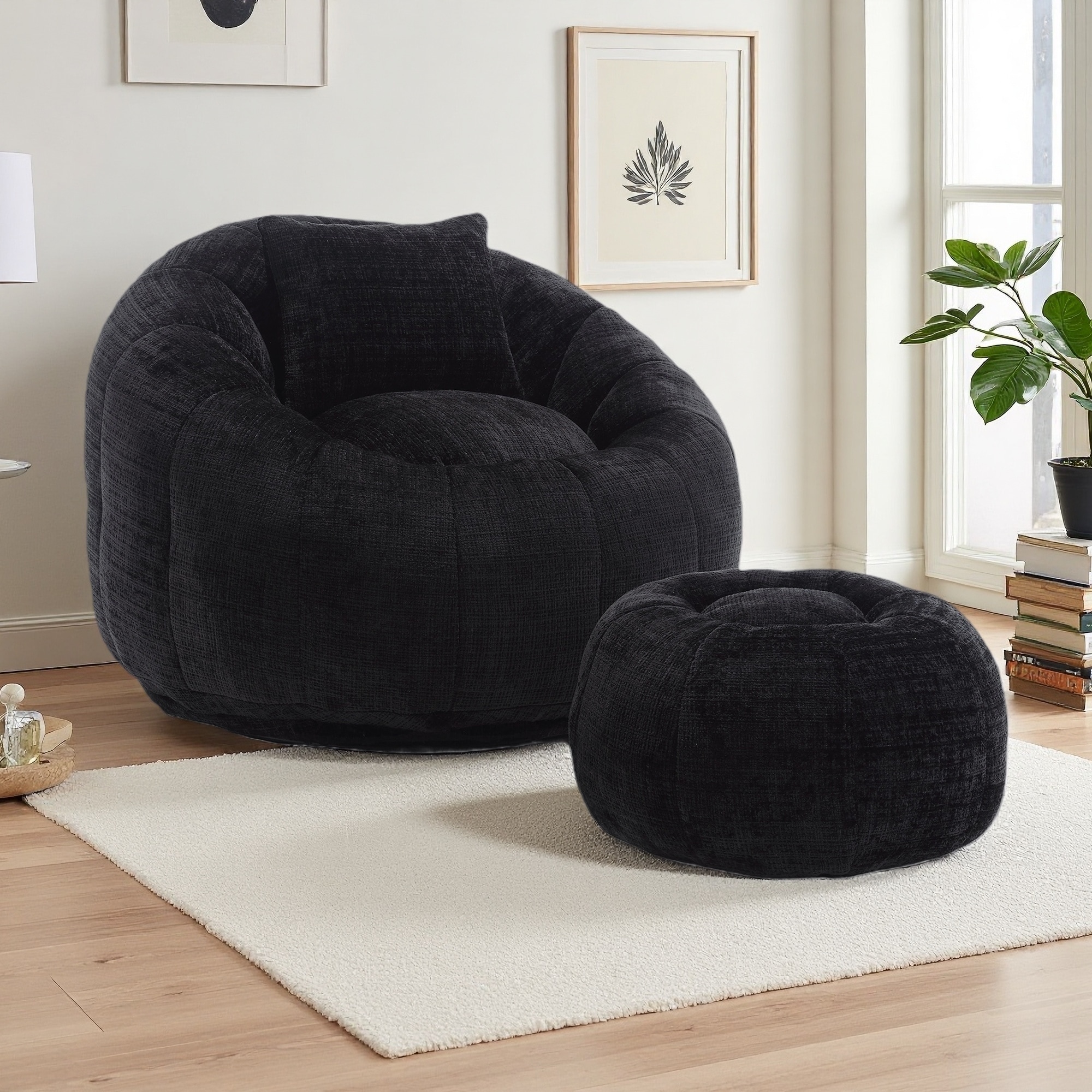 Chenille Fabric Round Bean Bag Chair and Ottoman Sets with High-Density Foam Filling