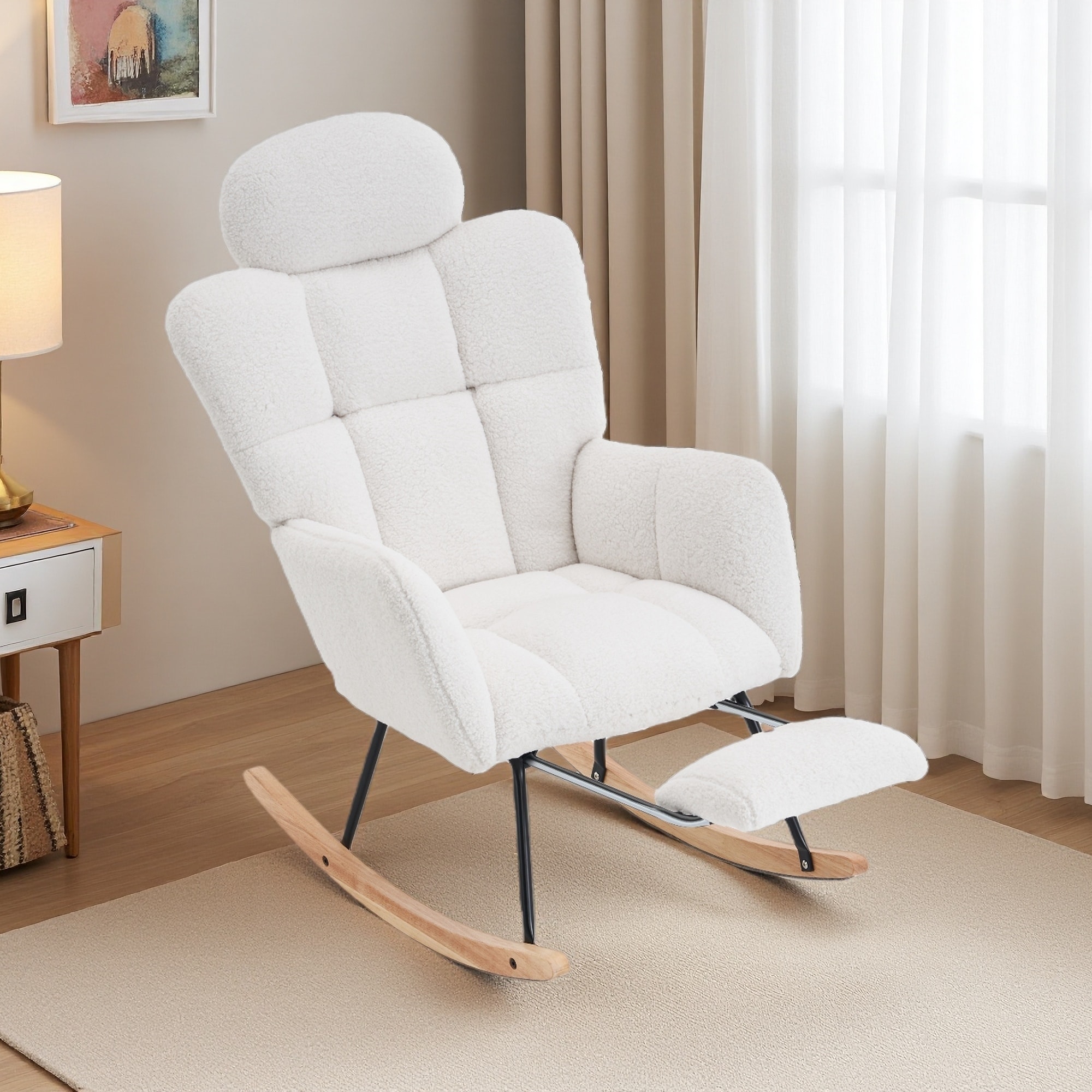 Teddy Fabric Upholstered Rocking Chair with Headrest Pillow and Footrest