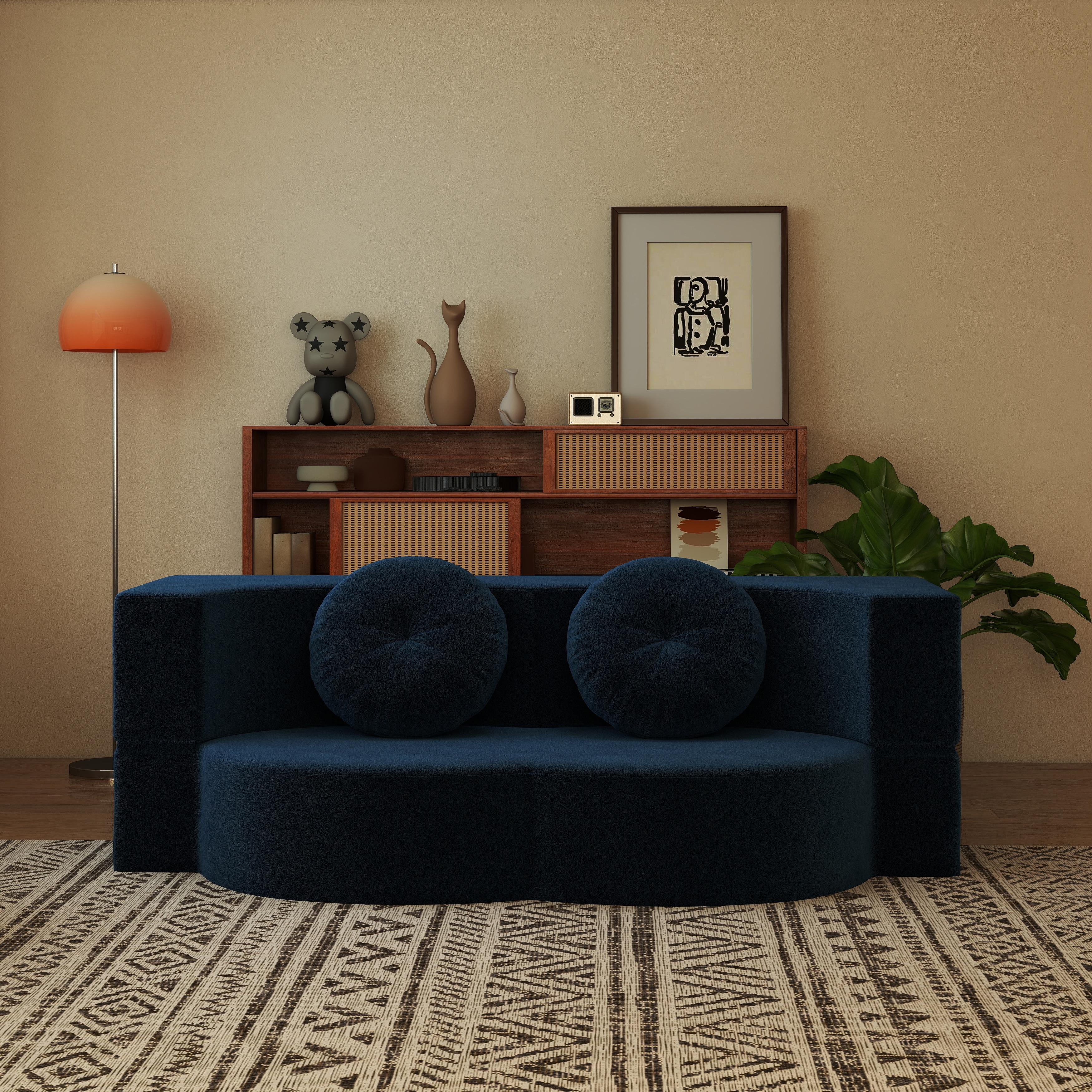 Modern 2-Seater Sofa Multi-Functional Folding Sofa Bed with Pillow, Curved Armrest, for Living Room, Apartment, Blue