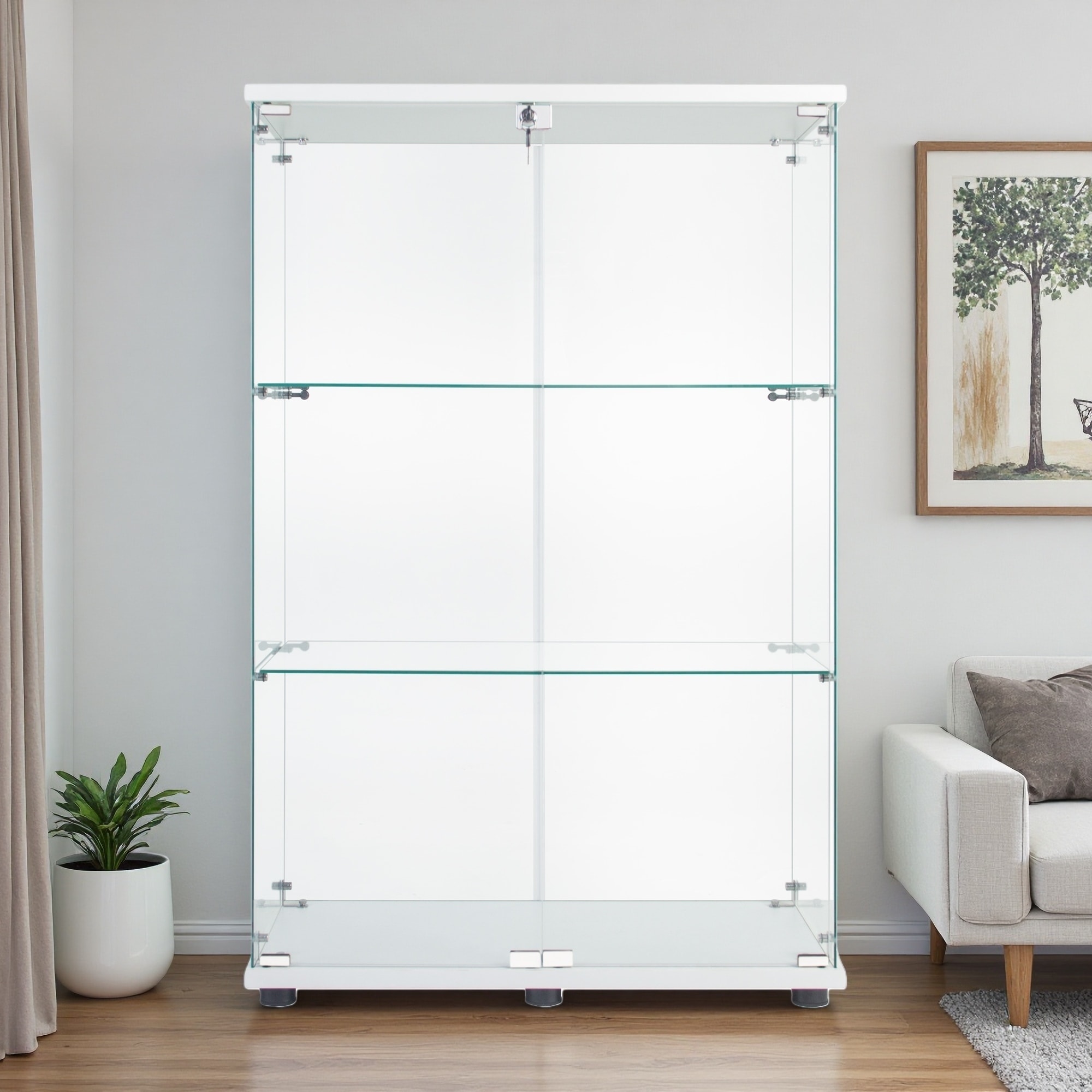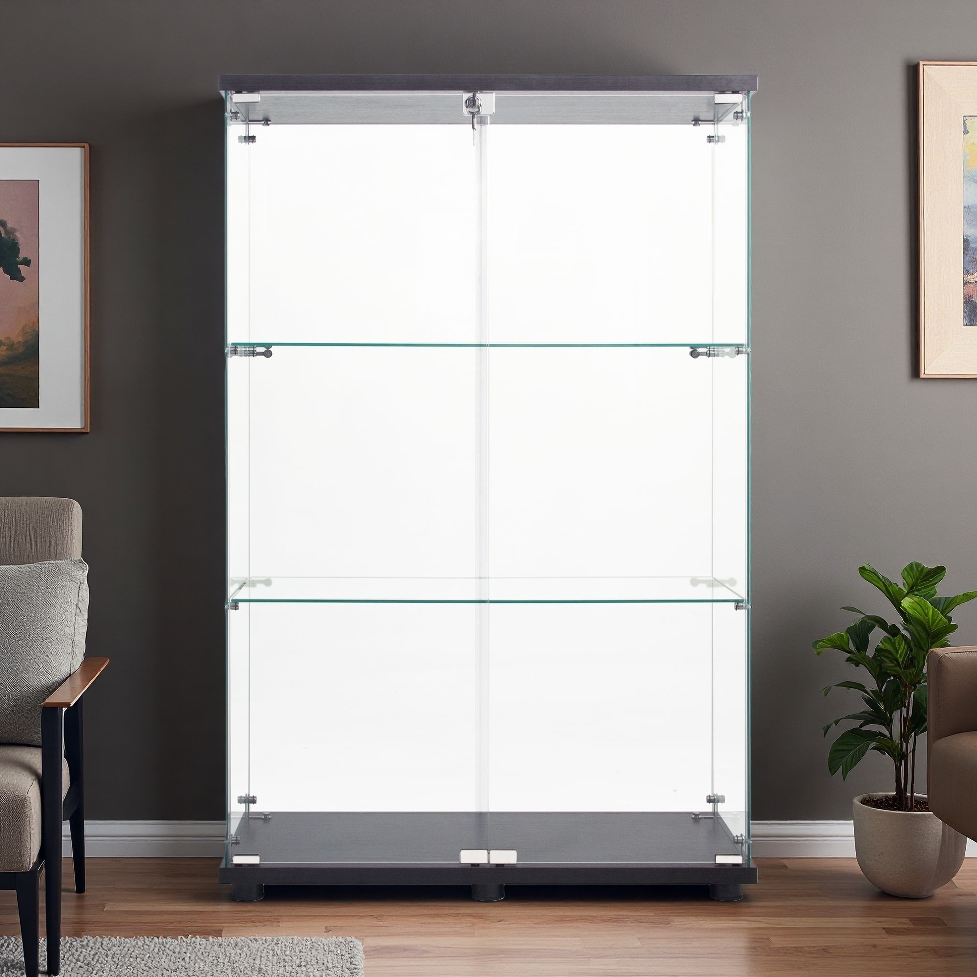 49"H Glass Display Cabinet, 2 Doors, 3 Shelves, Tempered Glass & Wood