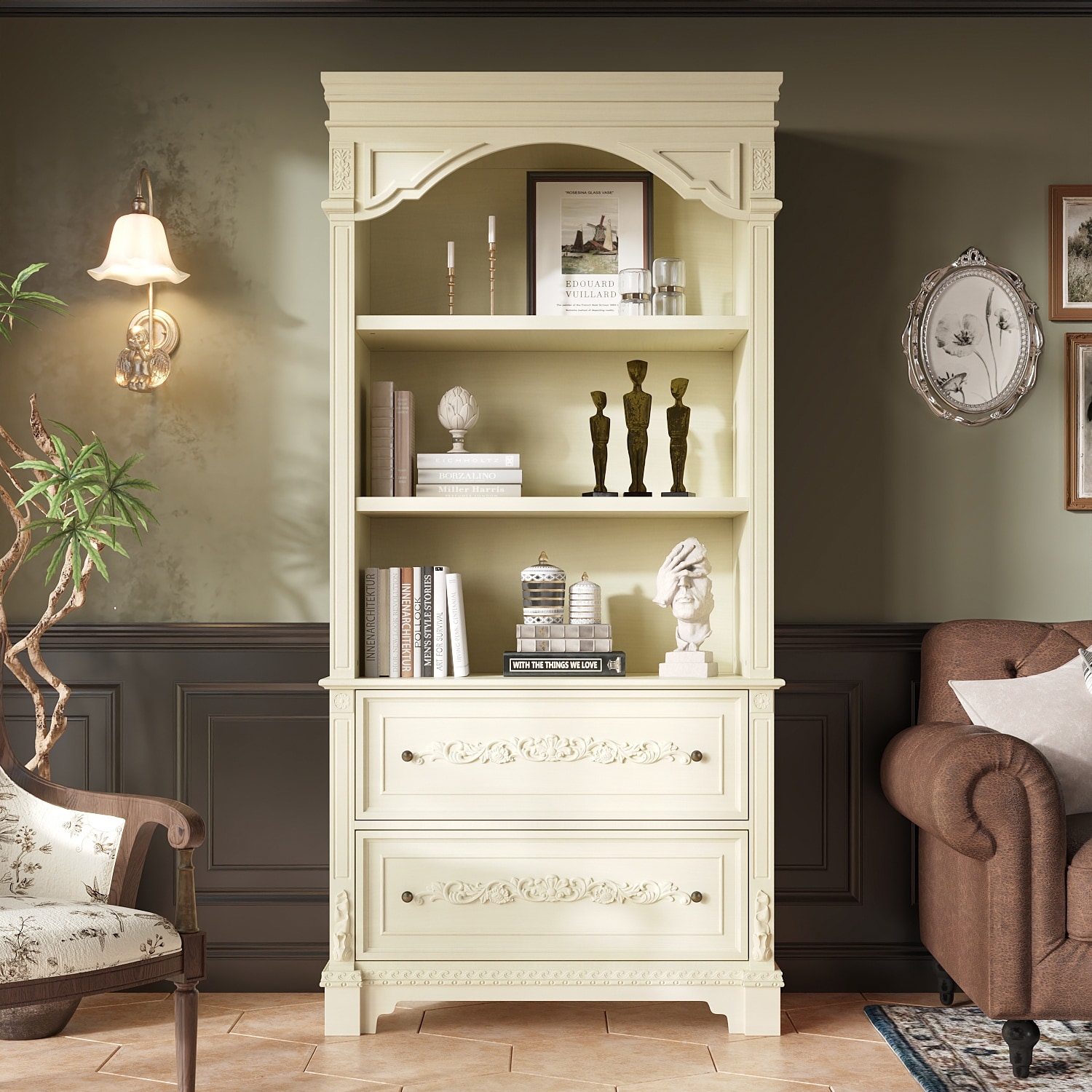 Classic Cream White Bookcase Cabinet with Drawers, Hand-Rubbed Finish and Antique Bronze Hardware, Elegant Storage Furniture