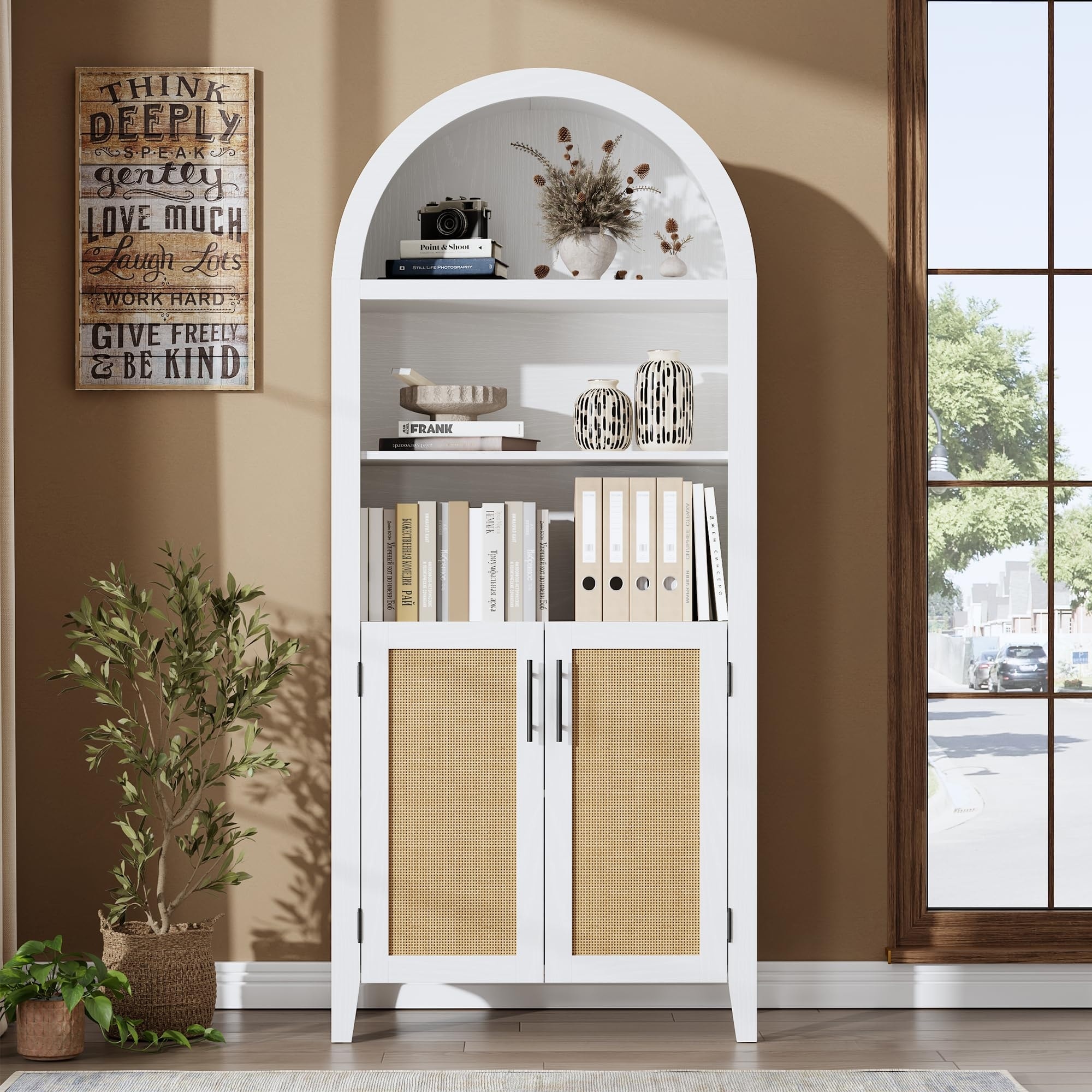 63" Arched Bookcase with Doors & Rattan Decor, 5-Tier Open Shelf Storage Cabinet for Home Office
