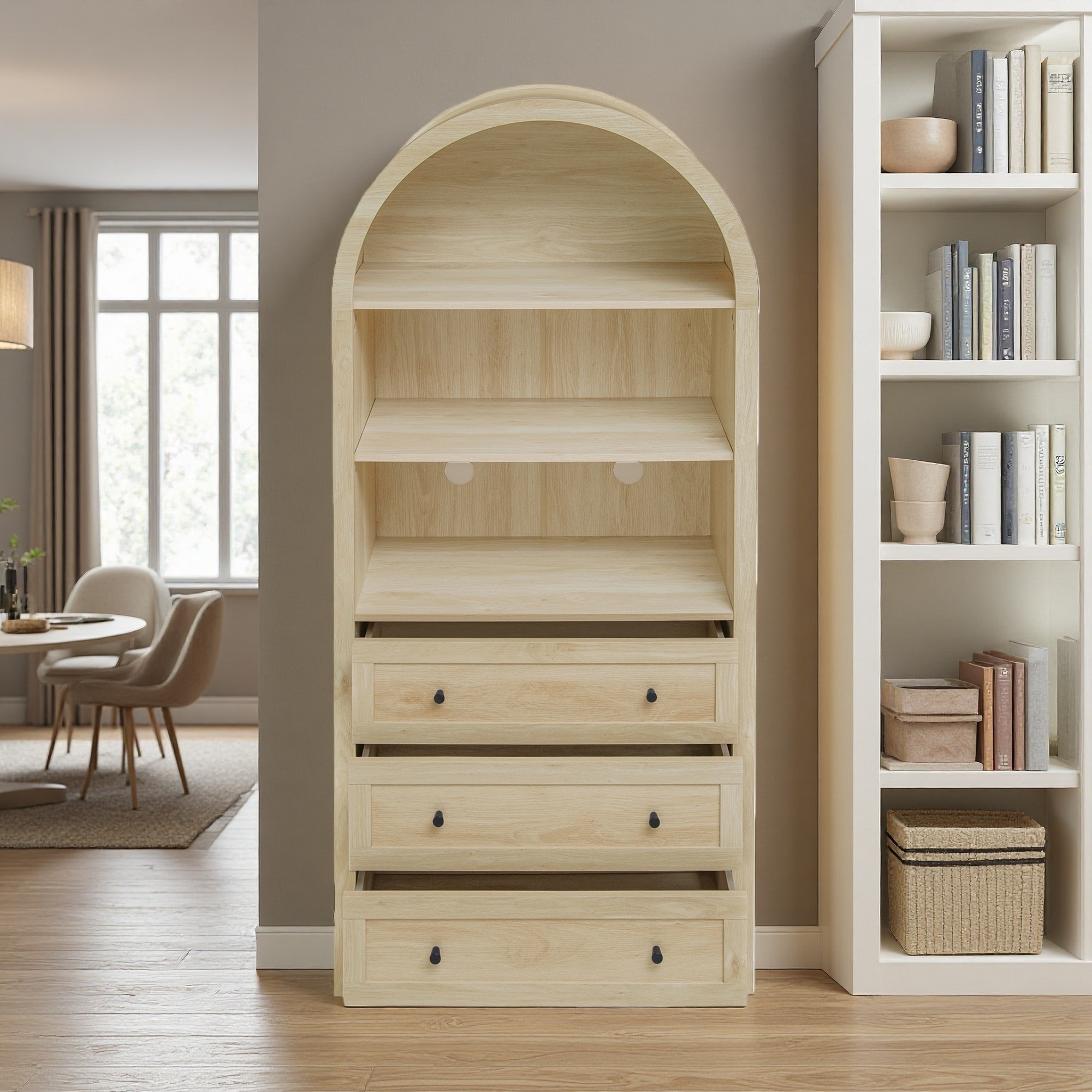 70"H Arched Kitchen Pantry Wood Storage Cabinet with Adjustable Shelves, 3 Drawers, Versatile Display Cupboard with Wall Anchors