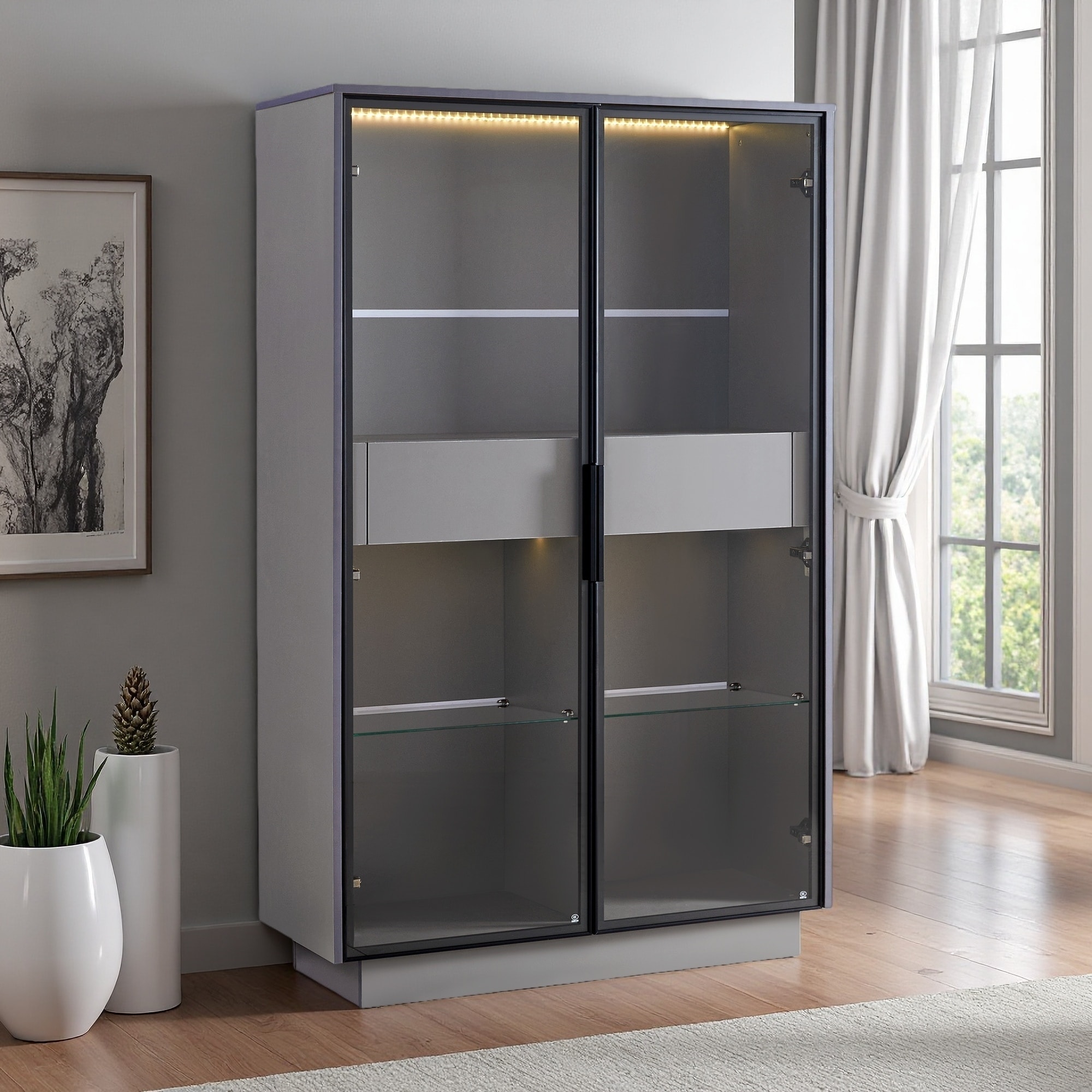 60.6"H Display Cabinet, LED, 2 Drawers, Glass Doors, Adjustable Shelves, Hallway/Office