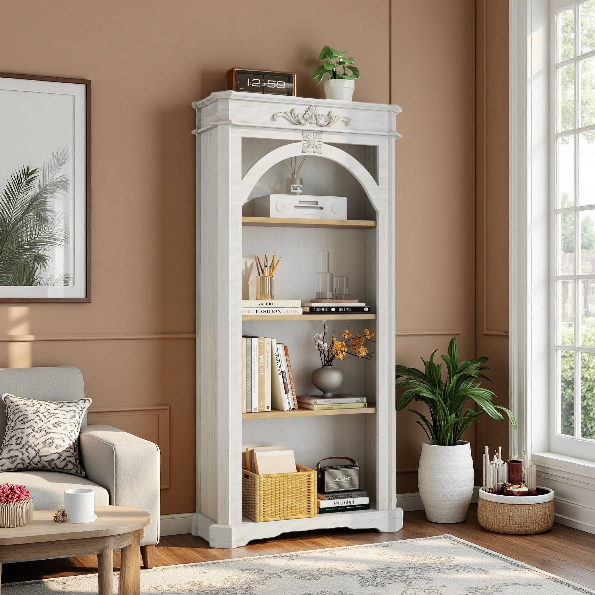 65"H Antique Distressed 4-Tier Bookshelf, Natural Wood, Easy Assembly