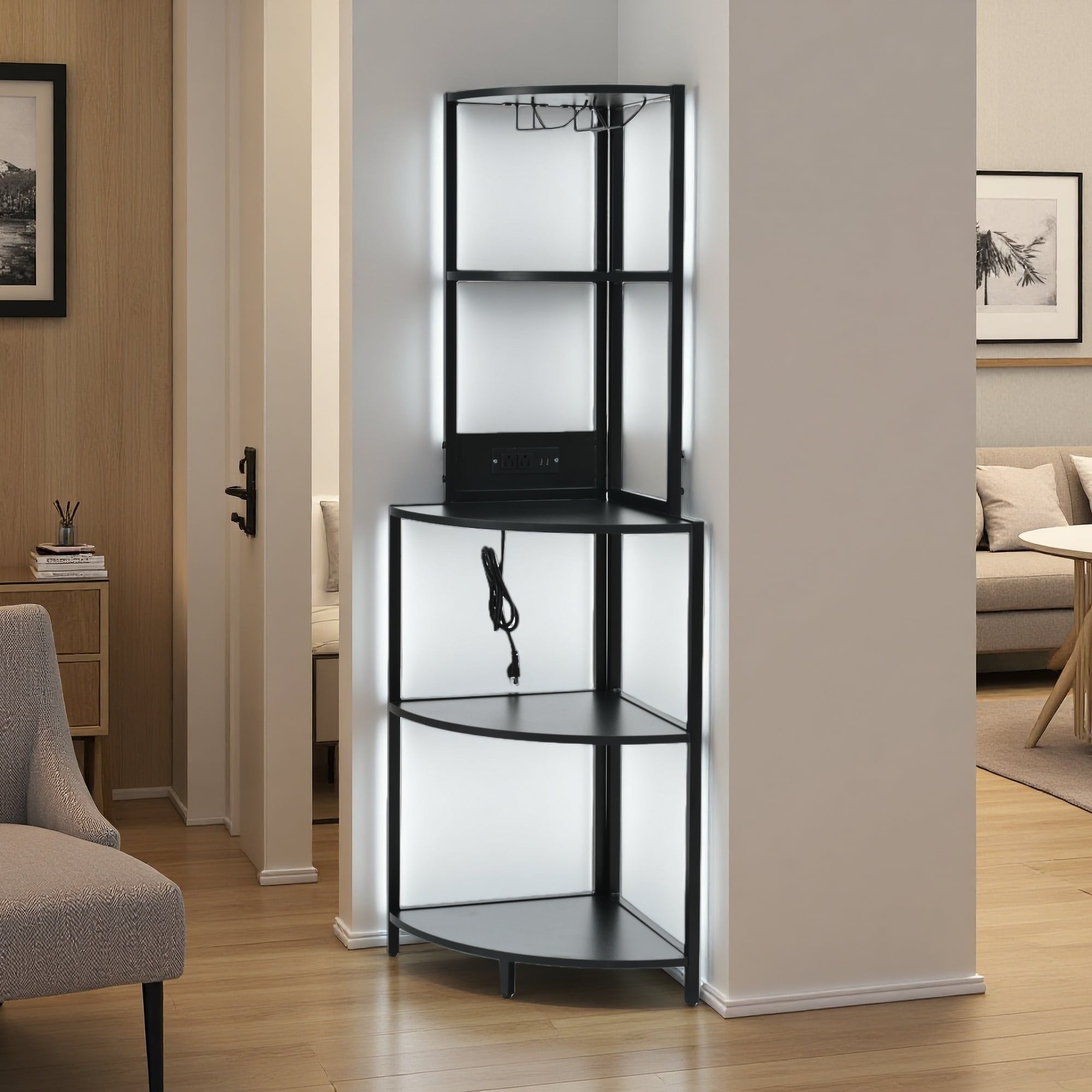 59.8"H 5-Tier Corner Shelf with LED Light & USB Plug, Glass Holder, Metal & MDF Freestanding Narrow Bookshelf for Wall Corner